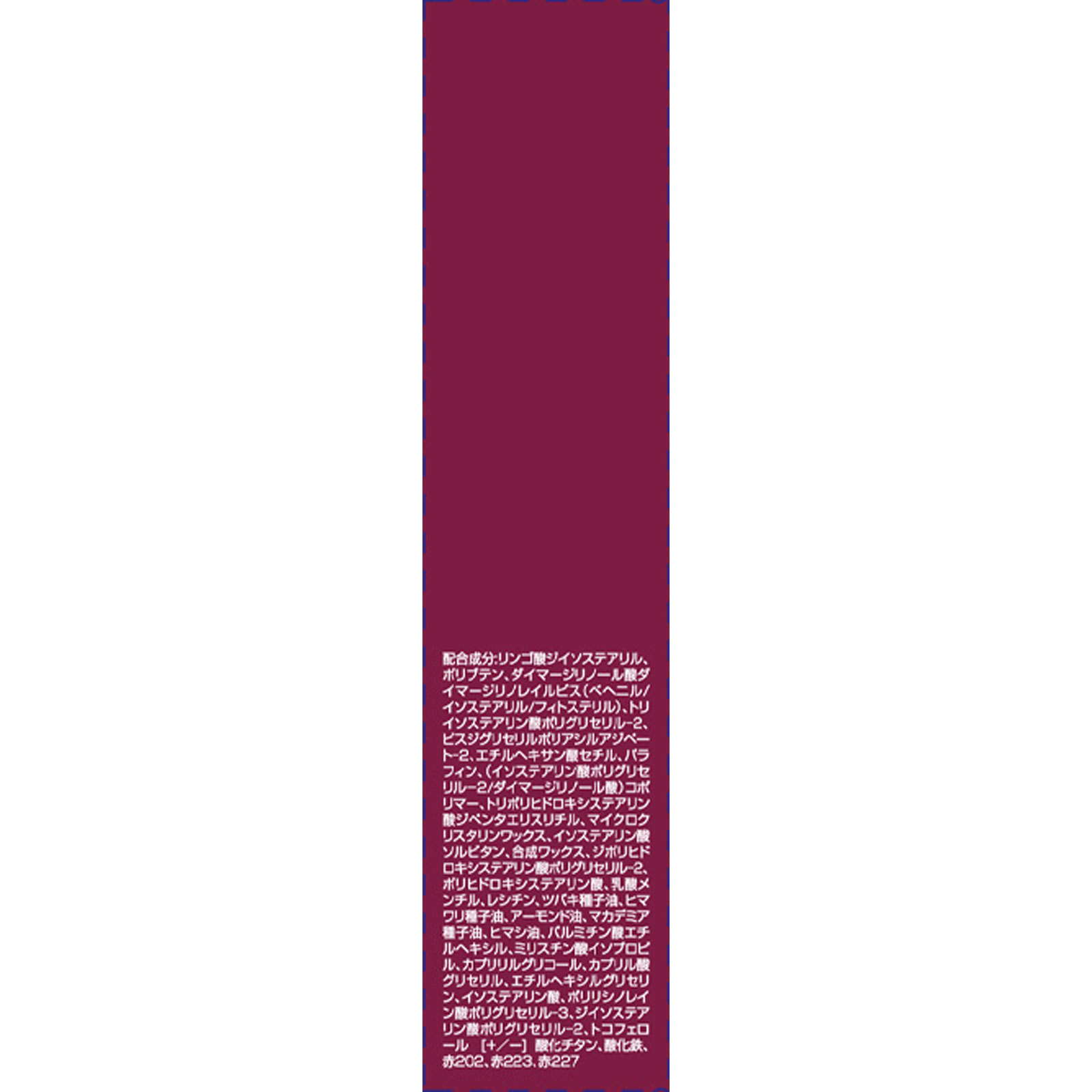 リンゴ酸ジイソステアリル、ポリブテン、ダイマージリノール酸ダイマージリノレイルビス(ベヘニル/イソステアリル/フィトステリル)、トリイソステアリン酸ポリグリセリル-2、ビスジグリセリルポリアシルアジペート-2、エチルヘキサン酸セチル、パラフィン、(イソステアリン酸ポリグリセリル-2/ダイマージリノール酸)コポリマー、トリポリヒドロキシステアリン酸ジペンタエリスリチル、マイクロクリスタリンワックス、イソステアリン酸ソルビタン、合成ワックス、ジポリヒドロキシステアリン酸ポリグリセリル-2、ポリヒドロキシステアリン酸、乳酸メンチル、レシチン、ツバキ種子油、ヒマワリ種子油、アーモンド油、マカデミア種子油、ヒマシ油、パルミチン酸エチルヘキシル、ミリスチン酸イソプロピル、カプリリルグリコール、カプリル酸グリセリル、エチルヘキシルグリセリン、イソステアリン酸、ポリリシノレイン酸ポリグリセリル-3、ジイソステアリン酸ポリグリセリル-2、トコフェロール[+/-]酸化チタン、酸化鉄、赤202、赤223、赤227
