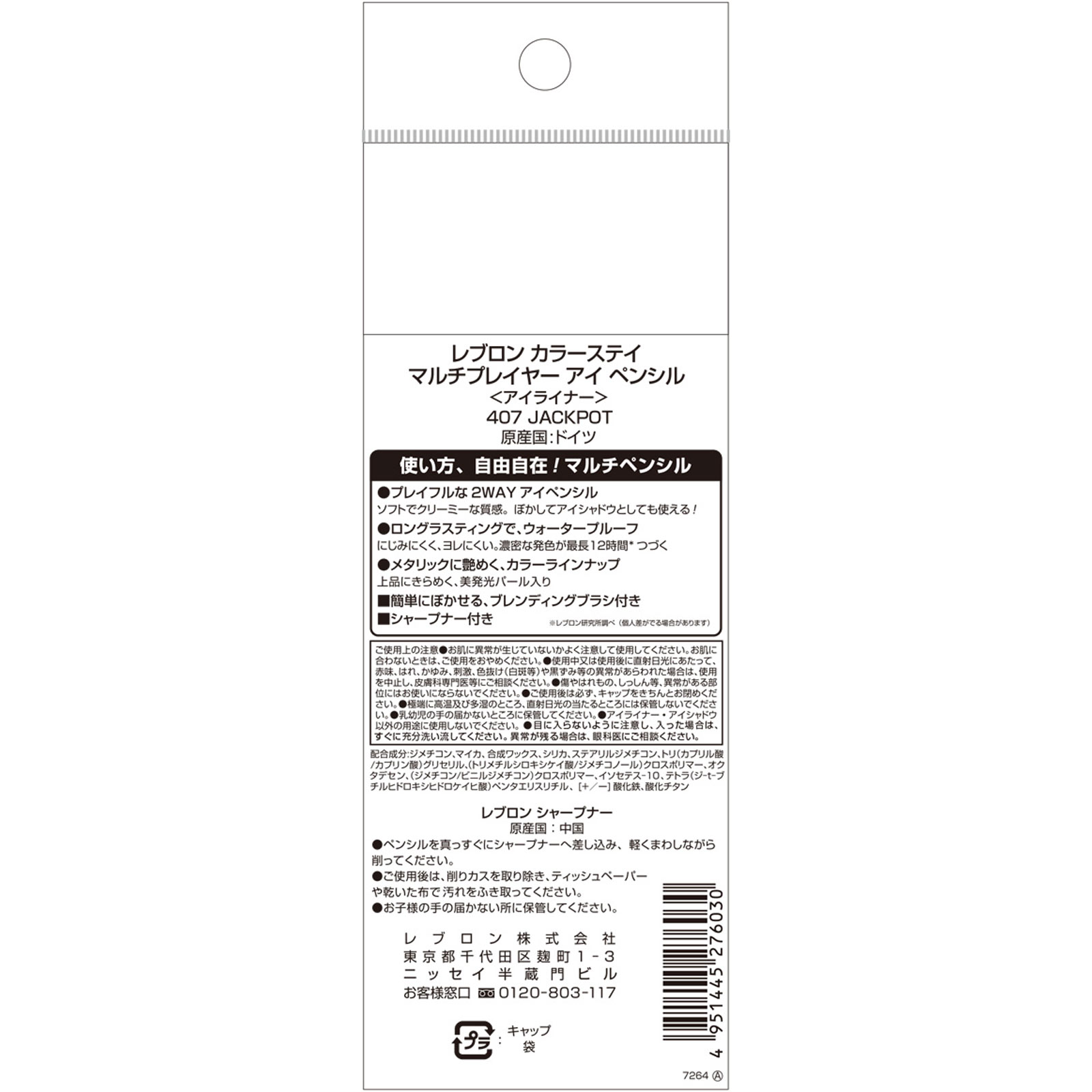 使い方、自由自在!マルチペンシル●プレイフルな2WAYアイペンシルソフトでクリーミーな質感。ぼかしてアイシャドウとしても使える!●ロングラスティングで、ウォータープルーフにじみにくく、ヨレにくい。濃密な発色が最長12時間※つづく●メタリックに艶めく、カラーラインナップ上品にきらめく、美発光パール入り■簡単にぼかせる、ブレンディングブラシ付き■シャープナー付き※レブロン研究所調べ(個人差がでる場合があります)