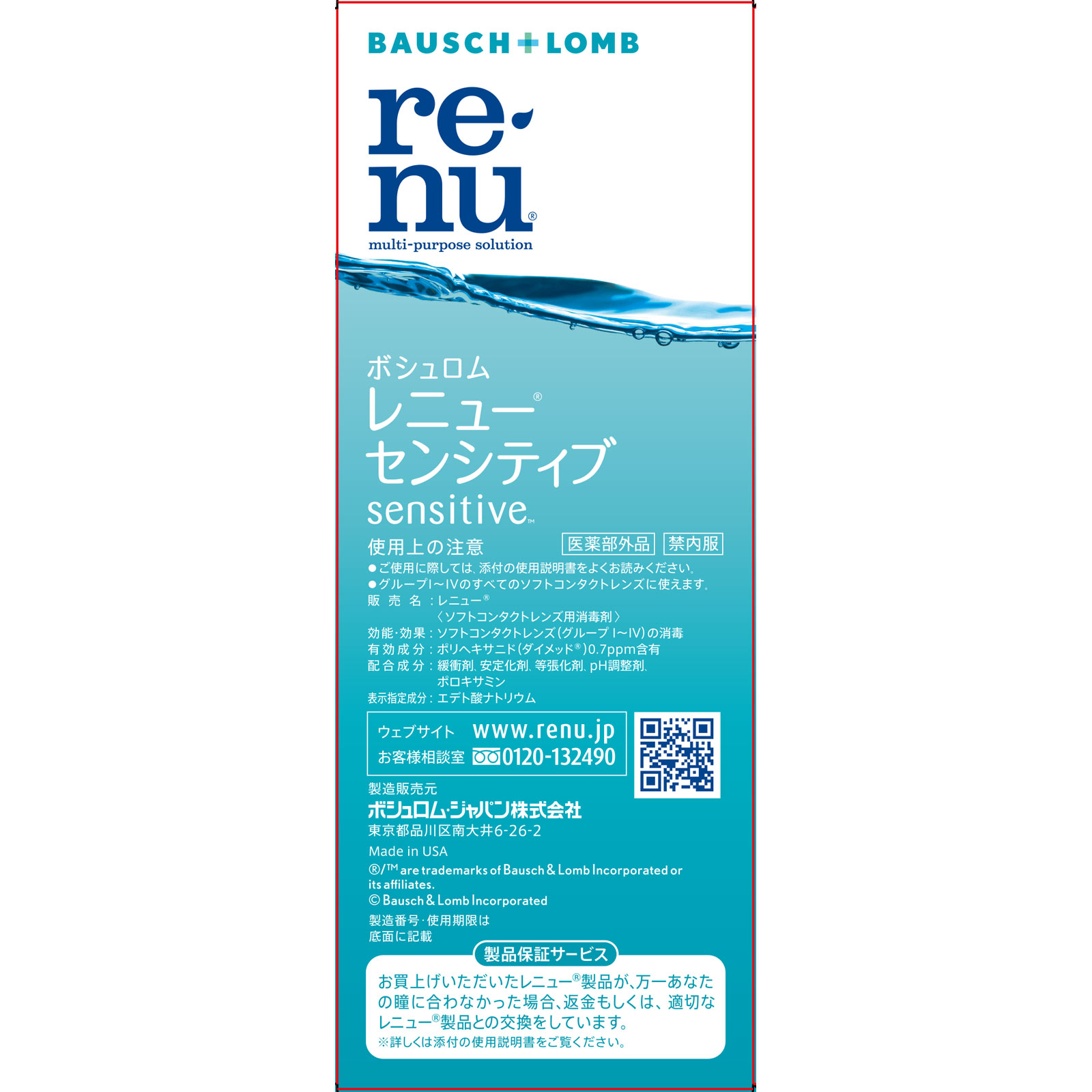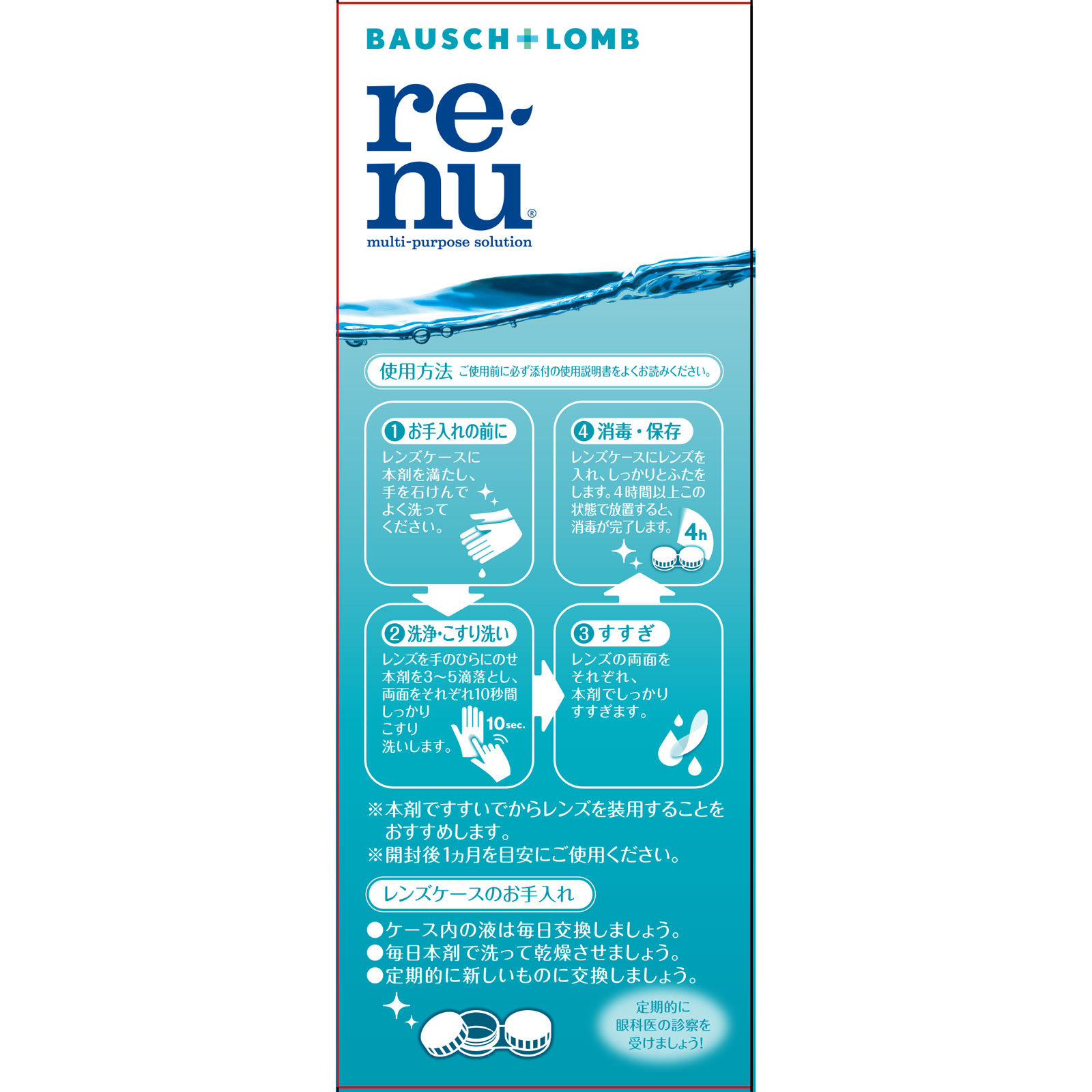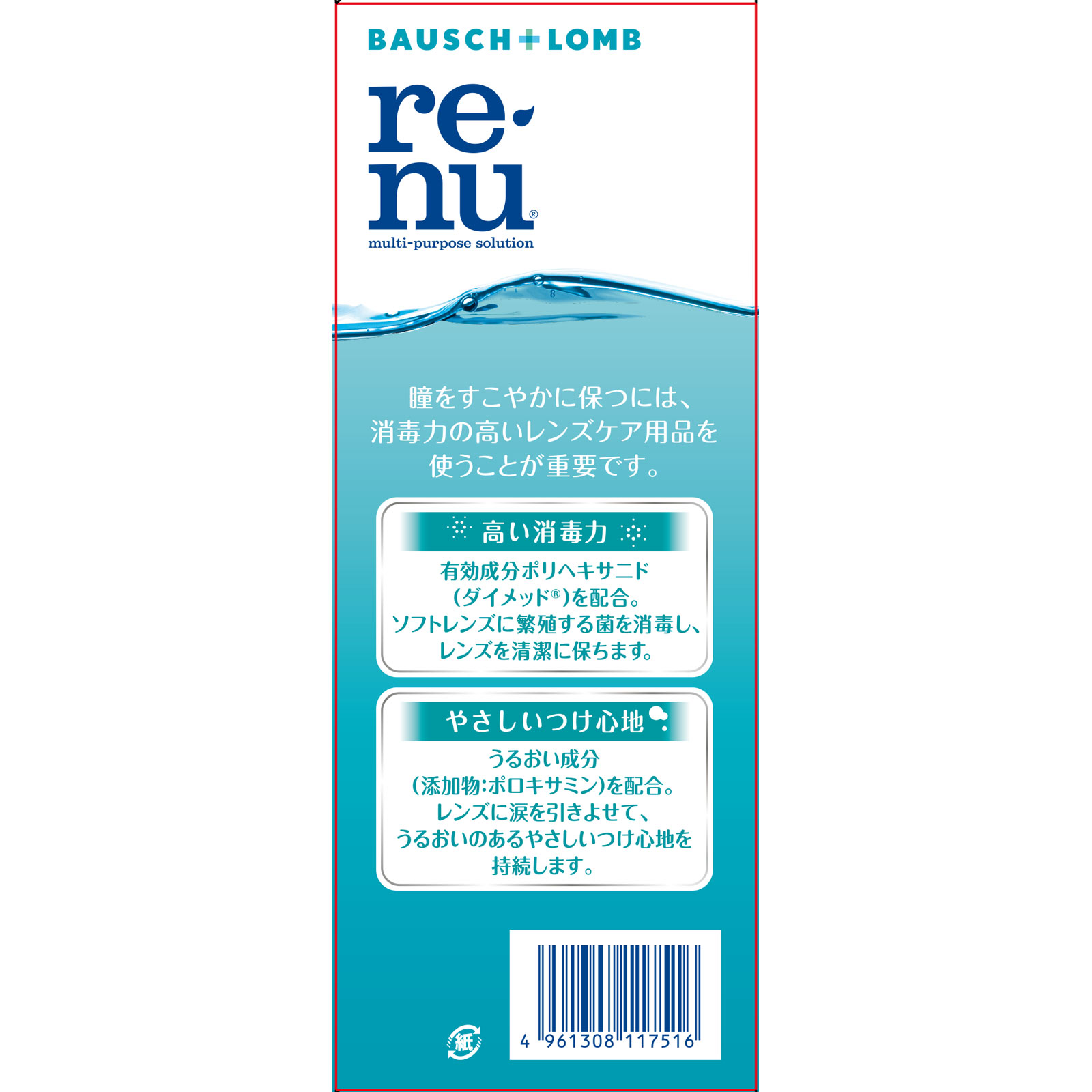 レンズ菌※1を消毒うるおい※2 やさしいつけ心地洗浄 すすぎ 消毒 保存 すべてが1ボトル使いやすいクリアボトル※1 全ての有害な微生物を含むわけではありません※2 うるおい成分(添加物)○高い消毒力有効成分ポリヘキサニド(ダイメッド)を配合。ソフトレンズに繁殖する菌を消毒し、レンズを清潔に保ちます。○やさしいつけ心地うるおい成分(添加物:ポロキサミン)を配合。レンズに涙を引きよせて、うるおいのあるやさしいつけ心地を持続します。全てのソフトコンタクトレンズに使えます