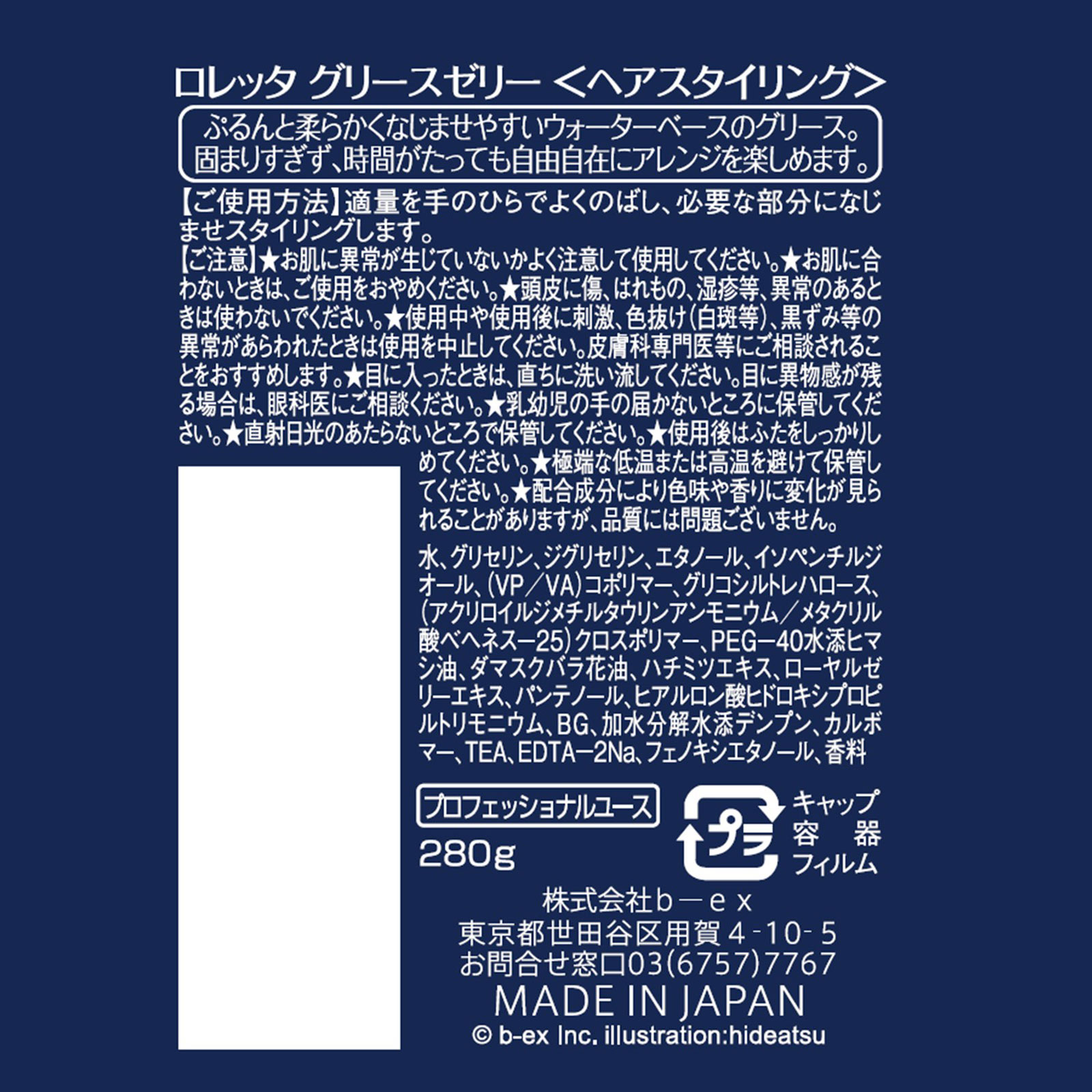 ぷるんと柔らかくなじませやすいウォーターベースのグリース。固まりすぎず、時間がたっても自由自在にアレンジを楽しめます。プロフェッショナルユース