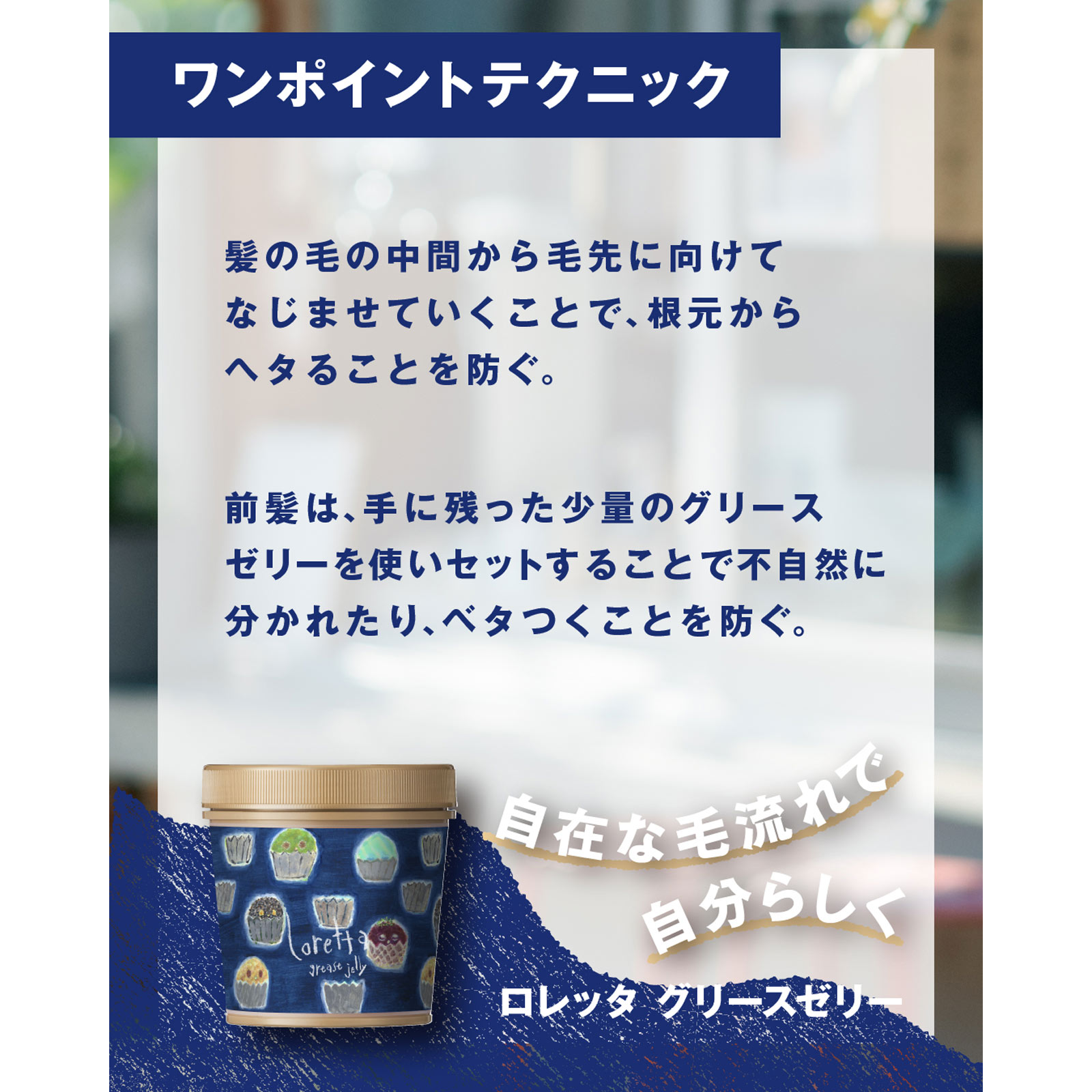 適量を手のひらでよくのばし、必要な部分になじませスタイリングします。