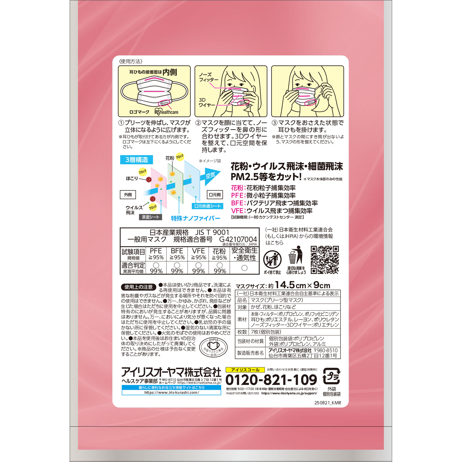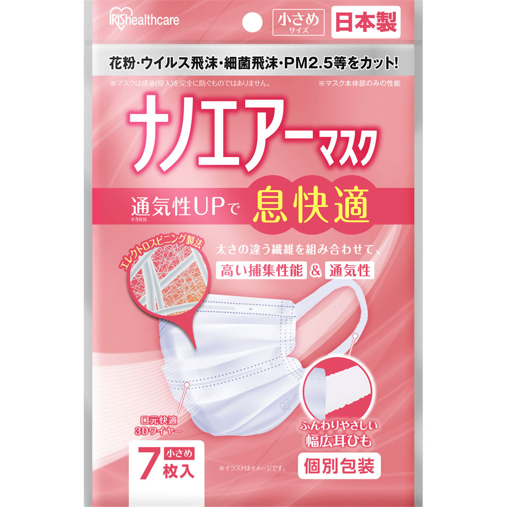 通気性UPで息快適 ※当社比エレクトロスピニング製法太さの違う繊維を組み合わせて、高い捕集性能&通気性個別包装●側面両端Vカット加工ほほとのすき間を低減し、長時間ぴったりフィットさらに花粉などの侵入をブロック●ふんわりやさしい幅広耳ひも●ダブルΩプリーツ加工&口元快適3Dワイヤー口元空間をキープするから会話がラク!花粉・ウイルス飛沫・細菌飛沫 PM2.5等をカット!※マスク本体部のみの性能花粉:花粉粒子捕集効率PFE:微小粒子捕集効率BFE:バクテリア飛まつ捕集効率VFE:ウイルス飛まつ捕集効率【試験機関:(一財)カケンテストセンター測定】対象:かぜ、花粉、ほこりなど
