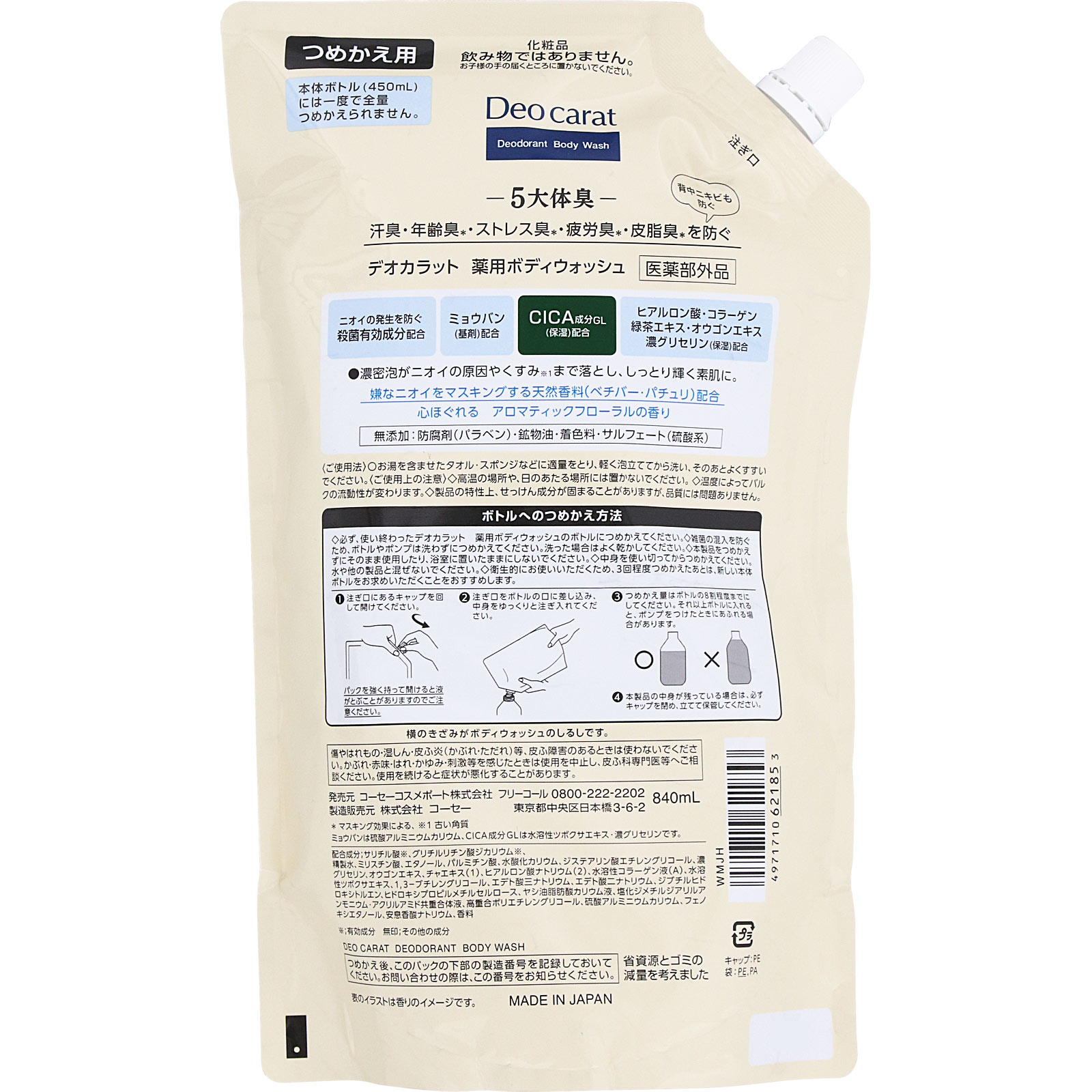 大容量840mLつめかえ通常サイズ(320mL)の2.6倍天然香料ベチバー・パチュリを使用した香りの効果*5大体臭をブロック 汗臭・年齢臭*・ストレス臭*・疲労臭・皮脂臭*ニオイも瞬時にキレイ背中ニキビも防ぐニオイの発生を防ぐ殺菌有効成分配合ミョウバン(基剤)配合CICA成分GL(保湿)配合ヒアルロン酸・コラーゲン 緑茶エキス・オウゴンエキス 濃グリセリン(保湿)配合●濃密泡がニオイの原因やくすみ※1まで落とし、しっとり輝く素肌に。嫌なニオイをマスキングする天然香料(ベチバー・パチュリ)配合心ほぐれる アロマティックフローラルの香り無添加:防腐剤(パラベン)・鉱物油・着色料・サルフェート(硫酸系)*マスキング効果による※1 古い角質ミョウバンは硫酸アルミニウムカリウム、CICA成分GLは水溶性壺草エキス・濃グリセリンです。