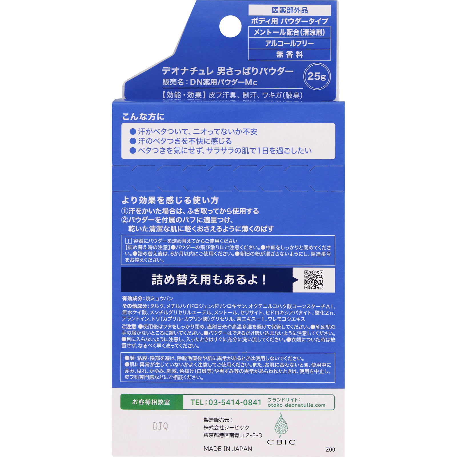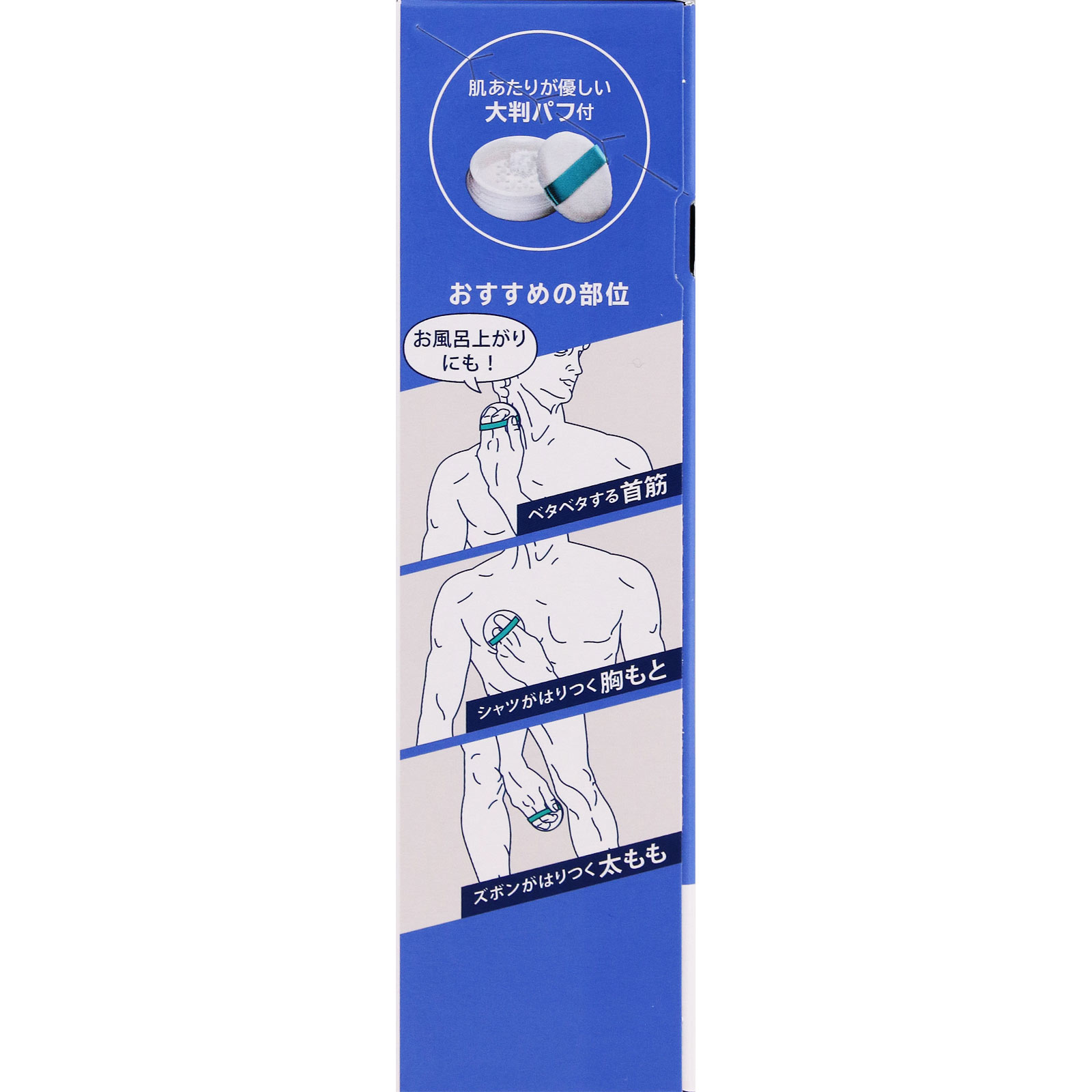 粉をパフで直にぬる汗・ニオイに効くパウダー薬用肌あたりが優しい大判パフ付おすすめの部位お風呂上がりにも!ベタベタする首筋シャツがはりつく胸もとズボンがはりつく太ももボディ用 パウダータイプメントール配合(清涼剤)アルコールフリー無香料<こんな方に>●汗がベタついて、ニオってないか不安●汗のベタつきを不快に感じる●ベタつきを気にせず、サラサラの肌で1日を過ごしたい