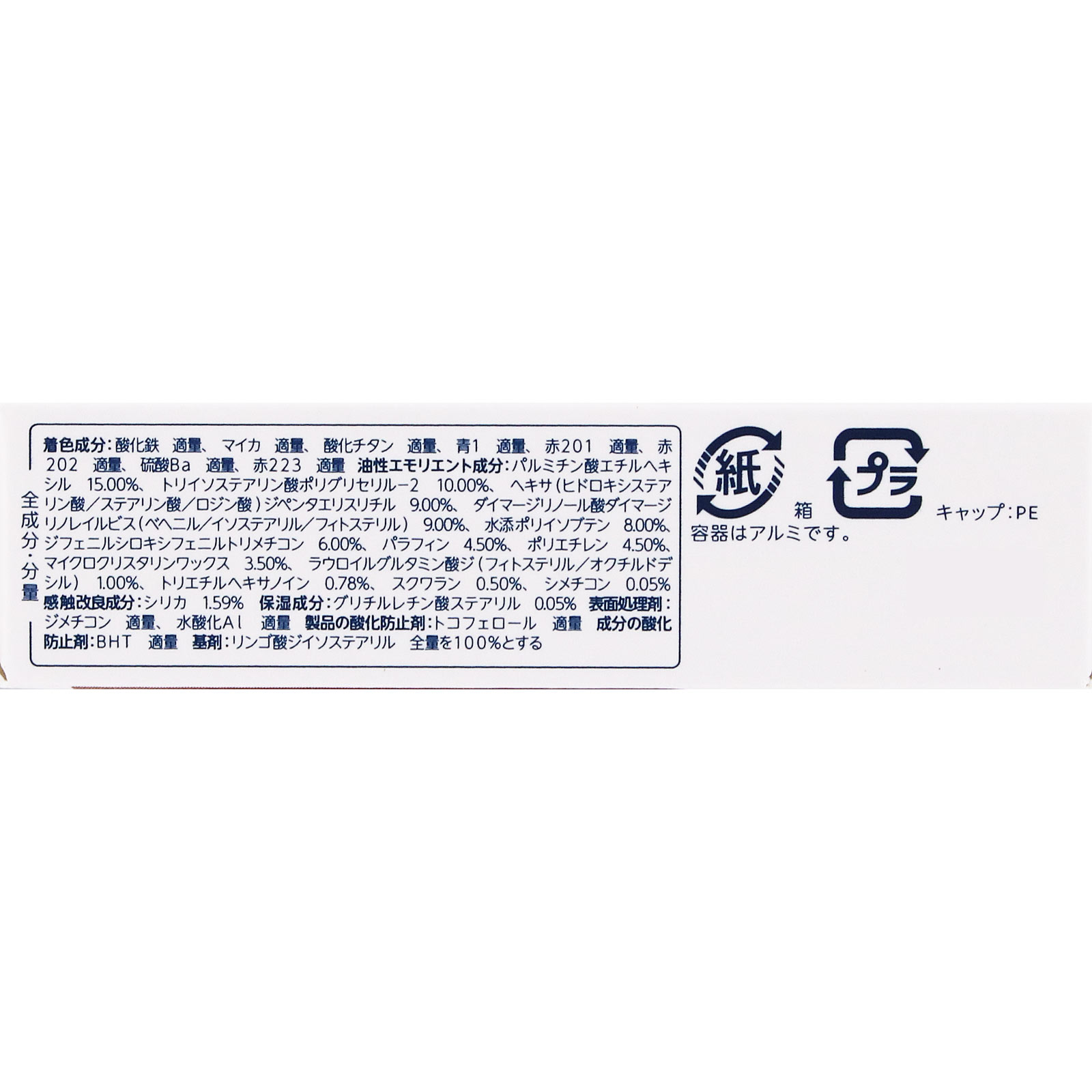 油性エモリエント成分:パルミチン酸エチルヘキシル 15.00%,トリイソステアリン酸ポリグリセリルー2 10.00%,ヘキサ(ヒドロキシステアリン酸/ステアリン酸/ロジン酸)ジペンタエリスリチル 9.00%,ダイマージリノール酸ダイマージリノレイルビス(ベヘニル/イソステアリル/フィトステリル) 9.00%,水添ポリイソブテン 8.00%,ジフェニルシロキシフェニルトリメチコン 6.00%,パラフィン 4.50%,ポリエチレン 4.50%,マイクロクリスタリンワックス 3.50%,ラウロイルグルタミン酸ジ(フィトステリル/オクチルドデシル) 1.00%,トリエチルヘキサノイン 0.78%,スクワラン 0.50%,シメチコン 0.05%