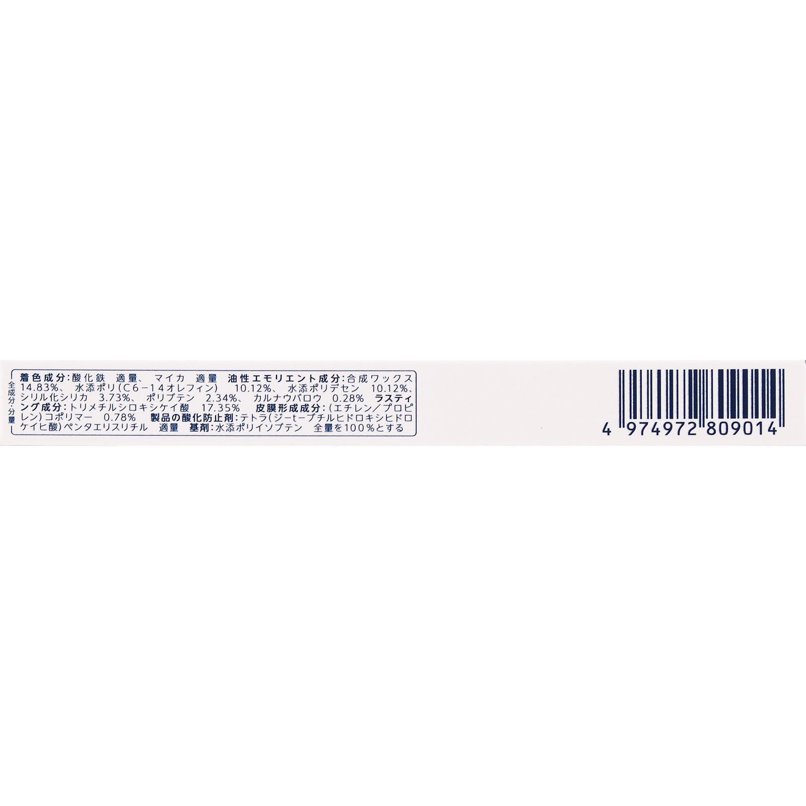 油性エモリエント成分:合成ワックス 14.83%,水添ポリ(C6-14オレフィン) 10.12%,水添ポリデセン 10.12%,シリル化シリカ 3.73%,ポリブテン 2.34%,カルナウバロウ 0.28%