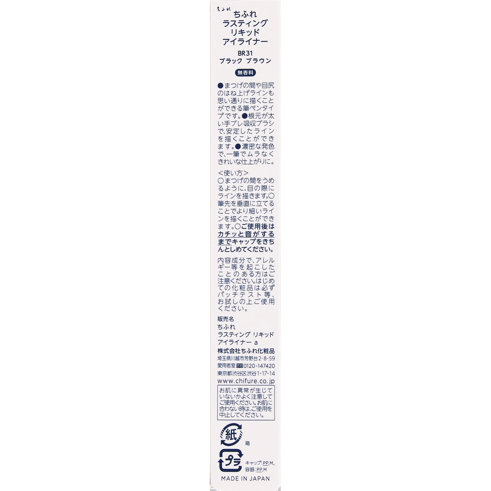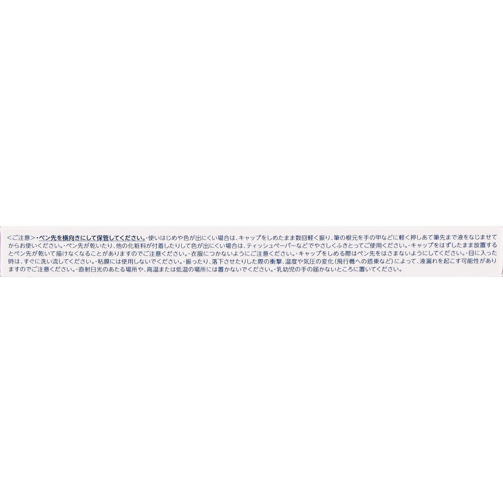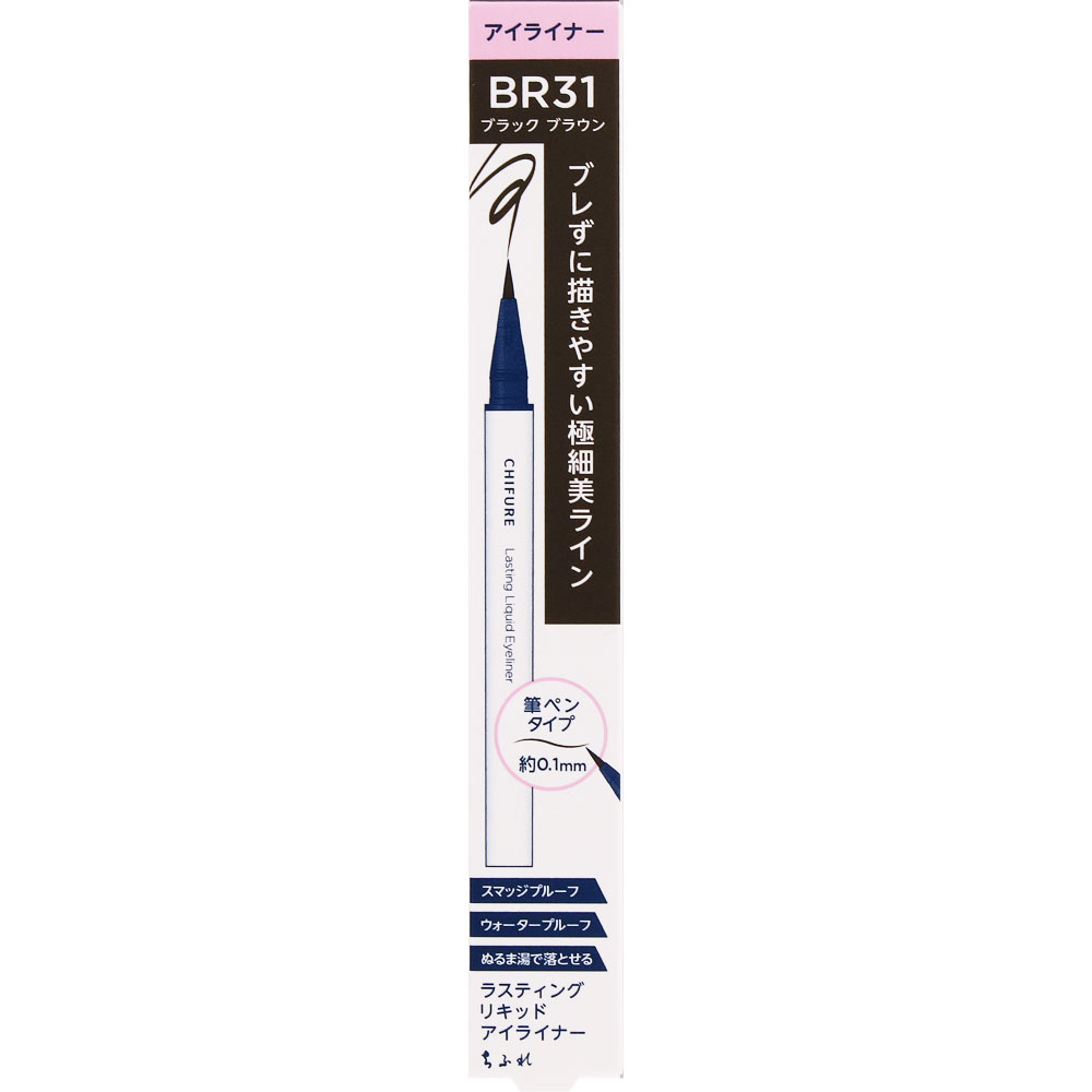 ブレずに書きやすい極細美ライン筆ペンタイプ約0.1mmスマッジプルーフウォータープルーフぬるま湯で落とせる無香料●まつげの間や目尻のはね上げラインも思い通りに描くことができる筆ペンタイプです。●根元が太い手ブレ吸収ブラシで、安定したラインを描くことができます。●濃密な発色で、一筆でムラなくきれいな仕上がりに。