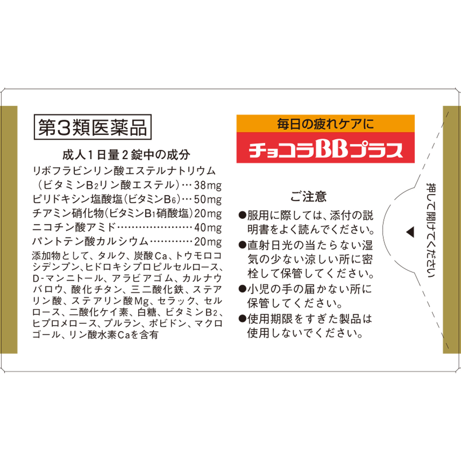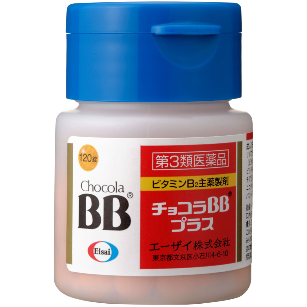肌荒れ、口内炎などに効果を発揮するビタミンB2製剤。ビタミンB2主薬製剤チョコラBBプラスは、肌あれ、にきび・吹き出物、口内炎の緩和と、疲れた時に効果的なビタミン剤です。吸収にすぐれた活性型ビタミンB2が、細胞の新陳代謝を助けて皮膚・粘膜の症状を改善します。また、バランスよく配合した5種類のビタミンB群が、食事から摂取した栄養素を効率よくエネルギーに変換して毎日の疲れをケアします。肌あれと疲れた時には小型でのみやすい錠剤のチョコラBBプラスがよく効きます。