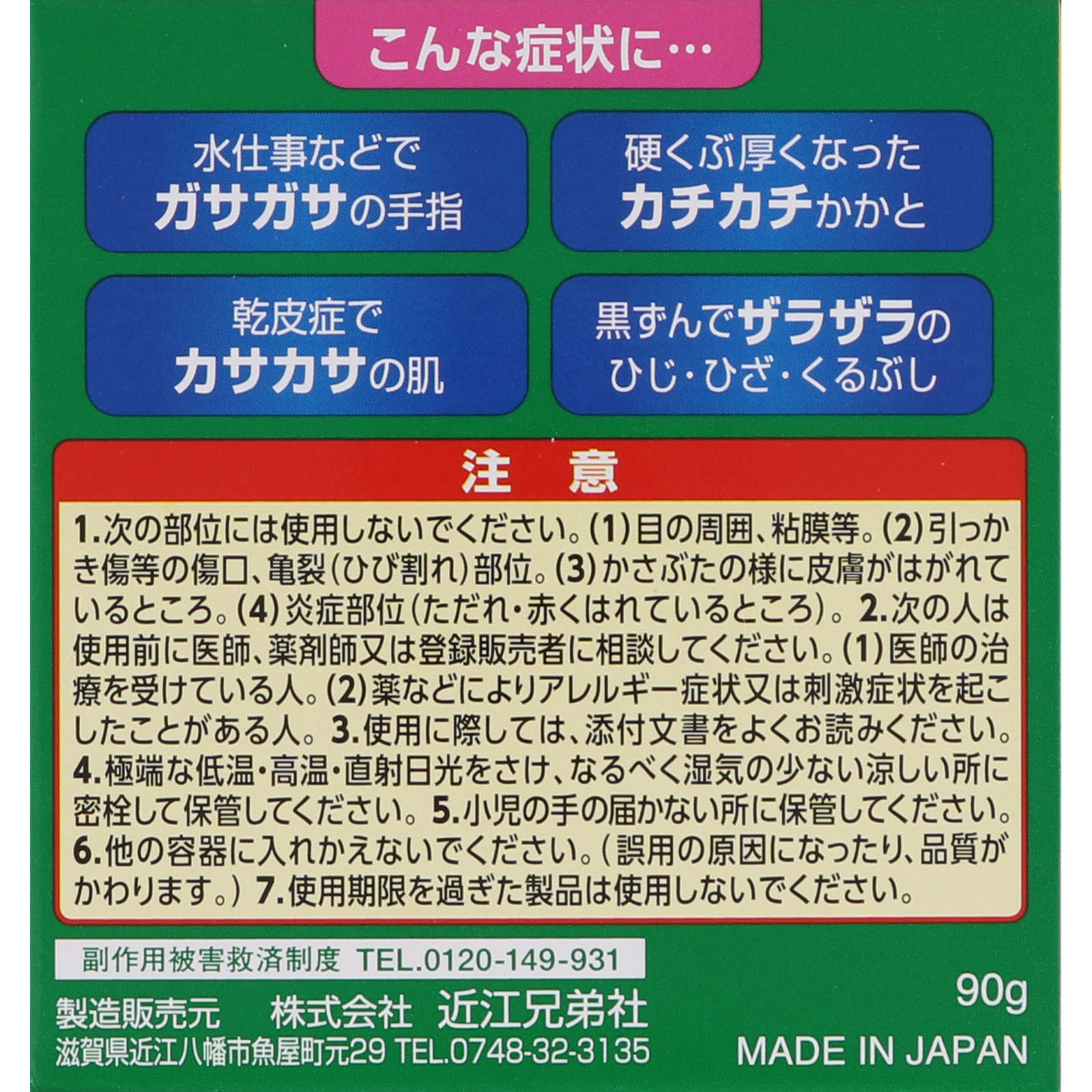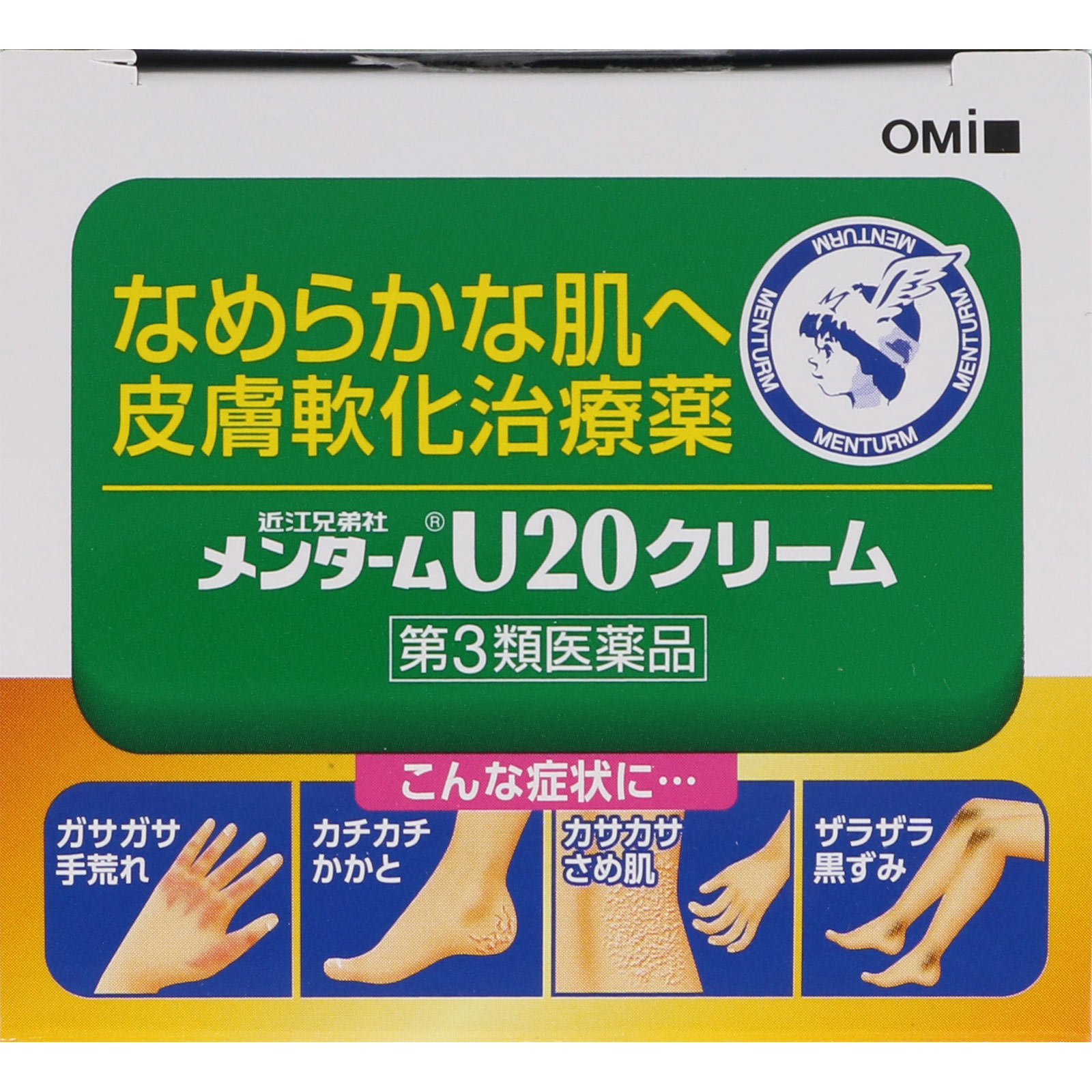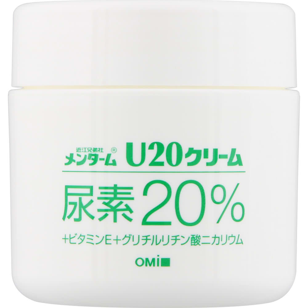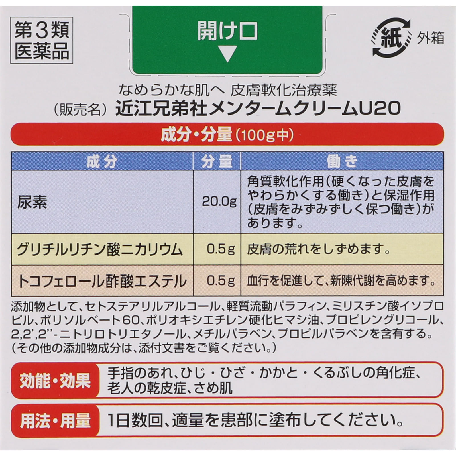 尿素20%に抗炎症成分などをプラスしたクリーム。なめらかな肌へ 皮膚軟化治療薬乾燥肌の手荒れ、カチカチになったかかと、黒ずんでザラザラのひじ・ひざ・くるぶしは、角質層の水分が不足しています。近江兄弟社メンタームクリームU20は、尿素を20%配合し体内にある水分を取り込んで角質層の水分を保持します。またビタミンE(トコフェロール酢酸エステル)とグリチルリチン酸二カリウムが血行をよくして肌荒れを防止します。3つの有効成分の働き・尿素(20%配合)保湿効果:角質層に水分を引きよせ、お肌のうるおいを保ちます。・ビタミンE血行促進効果:お肌の血行を促進し、新陳代謝を高めます。・グリチルリチン酸二カリウム炎症抑制効果:肌荒れを改善します。■こんな症状に・水仕事などでガサガサの手指・硬くぶ厚くなったカチカチかかと・乾皮症でカサカサの肌・黒ずんでザラザラのひじ・ひざ・くるぶし
