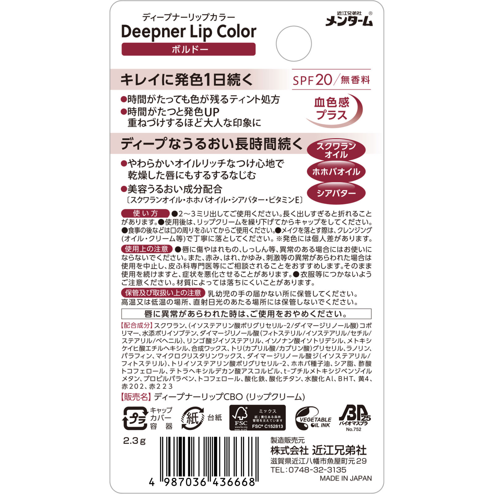 ティントリップひとぬりで艶やか発色 うるおい続くSPF20/無香料血色感プラス[キレイに発色1日続く]●時間がたっても色が残るティント処方●時間がたつと発色UP 重ねづけするほど大人な印象に[ディープなうるおい長時間続く]●やわらかいオイルリッチなつけ心地で乾燥した唇にもするするなじむ●美容うるおい成分配合〔スクワランオイル・ホホバオイル・シアバター・ビタミンE〕