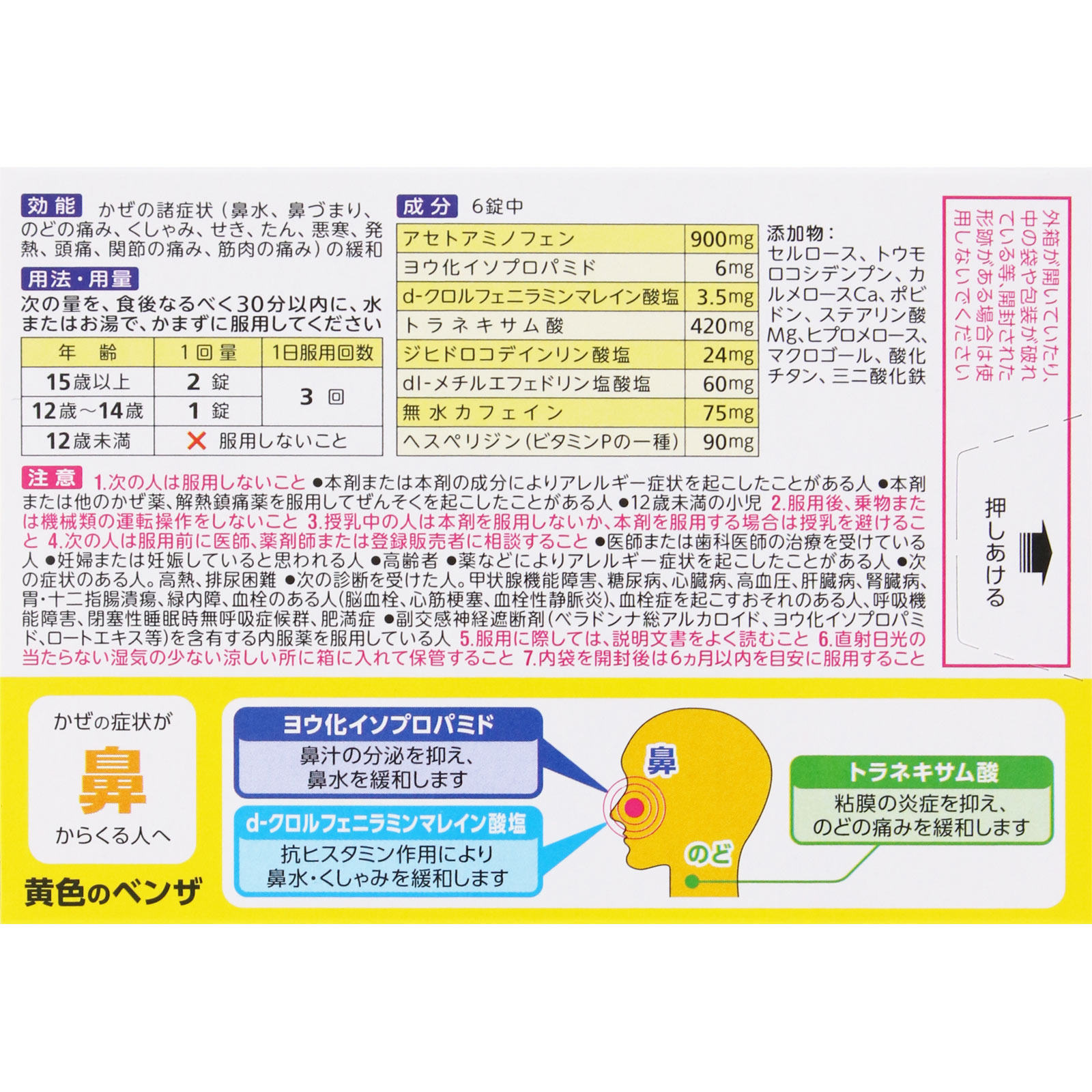 鼻水がつらいかぜのために、炎症を抑えて鼻水を抑える処方です。●鼻汁の分泌を抑えるヨウ化イソプロパミドと、抗ヒスタミン成分のd-クロルフェニラミンマレイン酸塩配合で、鼻水・くしゃみを緩和します。●トラネキサム酸が粘膜の炎症を抑え、のどの痛みを緩和します。●解熱鎮痛成分アセトアミノフェンなど8種の成分がバランスよくはたらいて、かぜのいろいろな症状を緩和します。●のみやすい小型の淡黄色のカプレットタイプの錠剤です。