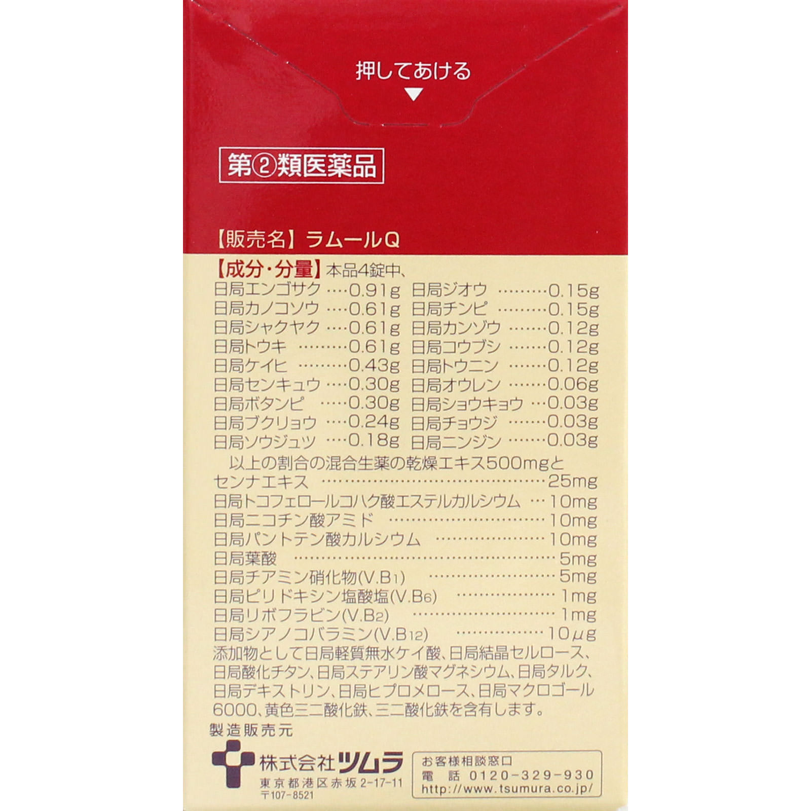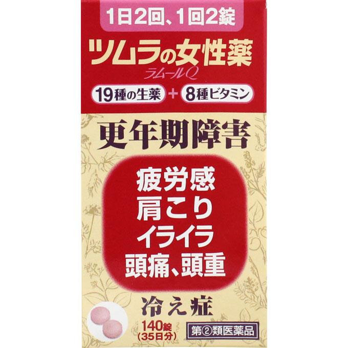 女性のお悩みに効果的な生薬主薬製剤。ビタミンも配合。婦人薬ツムラの女性薬『ラムールQ』は、女性特有の諸症状に用いられている中将湯処方に鎮痛効果のあるエンゴサクや鎮静効果のあるカノコソウを配合して抽出したエキスに、センナエキス、8種のビタミンを配合して製したフィルムコート錠です。「更年期障害」や「冷え症」に伴う「疲労感」、「肩こり」、「イライラ」、「頭痛」、「頭重」等の不快な症状を改善します。