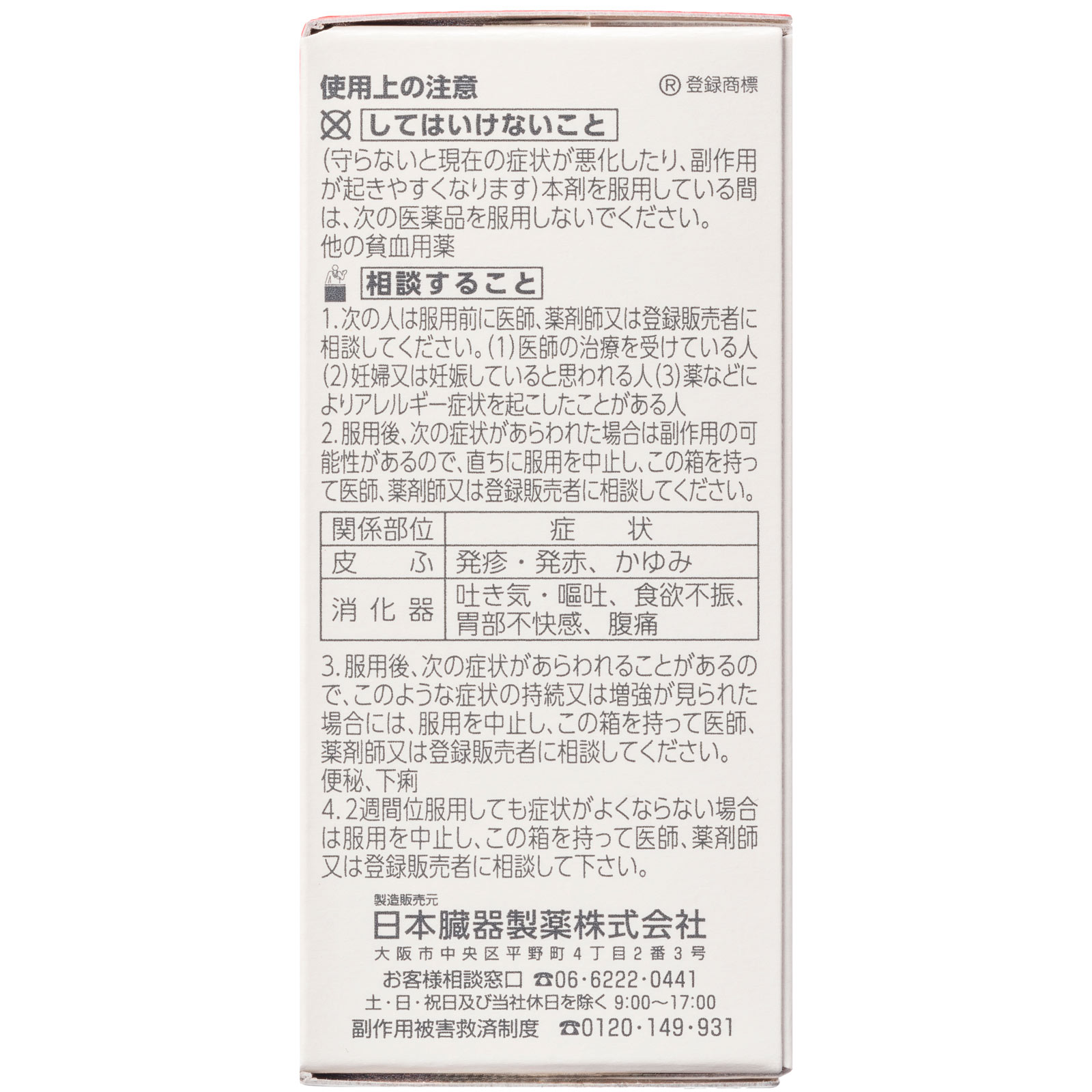2.服用後、次の症状があらわれた場合は副作用の可能性があるので、直ちに服用を中止し、この箱を持って医師、薬剤師又は登録販売者に相談してください。