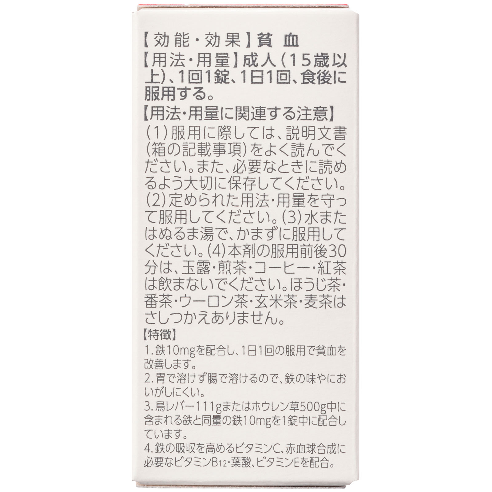 体に吸収されやすい鉄分に、ビタミンなどを配合した貧血用薬。1.鉄10mgを配合し、1日1回の服用で貧血を改善します。2.胃で溶けず腸で溶けるので、鉄の味やにおいがしにくい。3.鳥レバー111gまたはホウレン草500g中に含まれる鉄と同量の鉄10mgを1錠中に配合しています。4.鉄の吸収を高めるビタミンC、赤血球合成に必要なビタミンB12・葉酸、ビタミンEを配合。