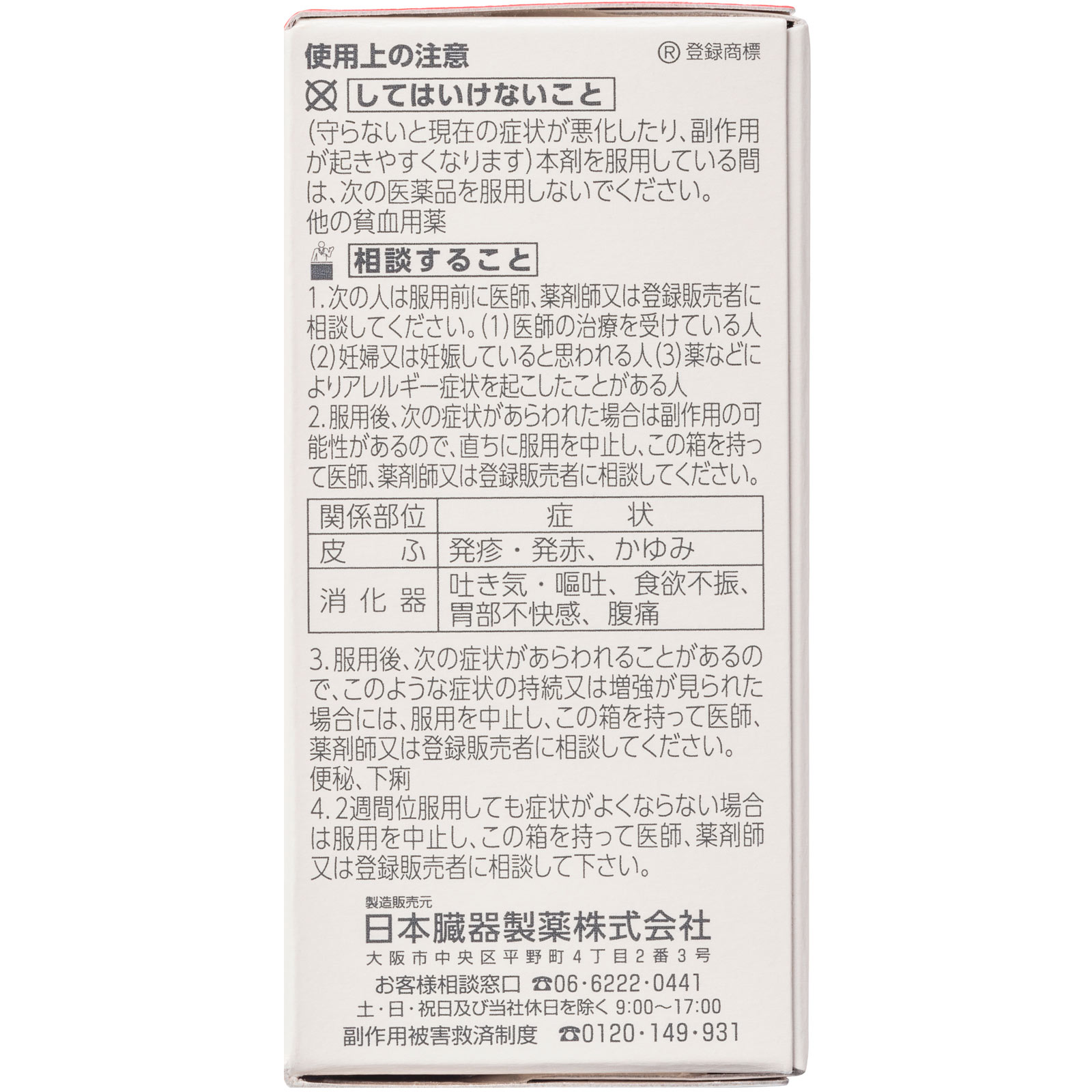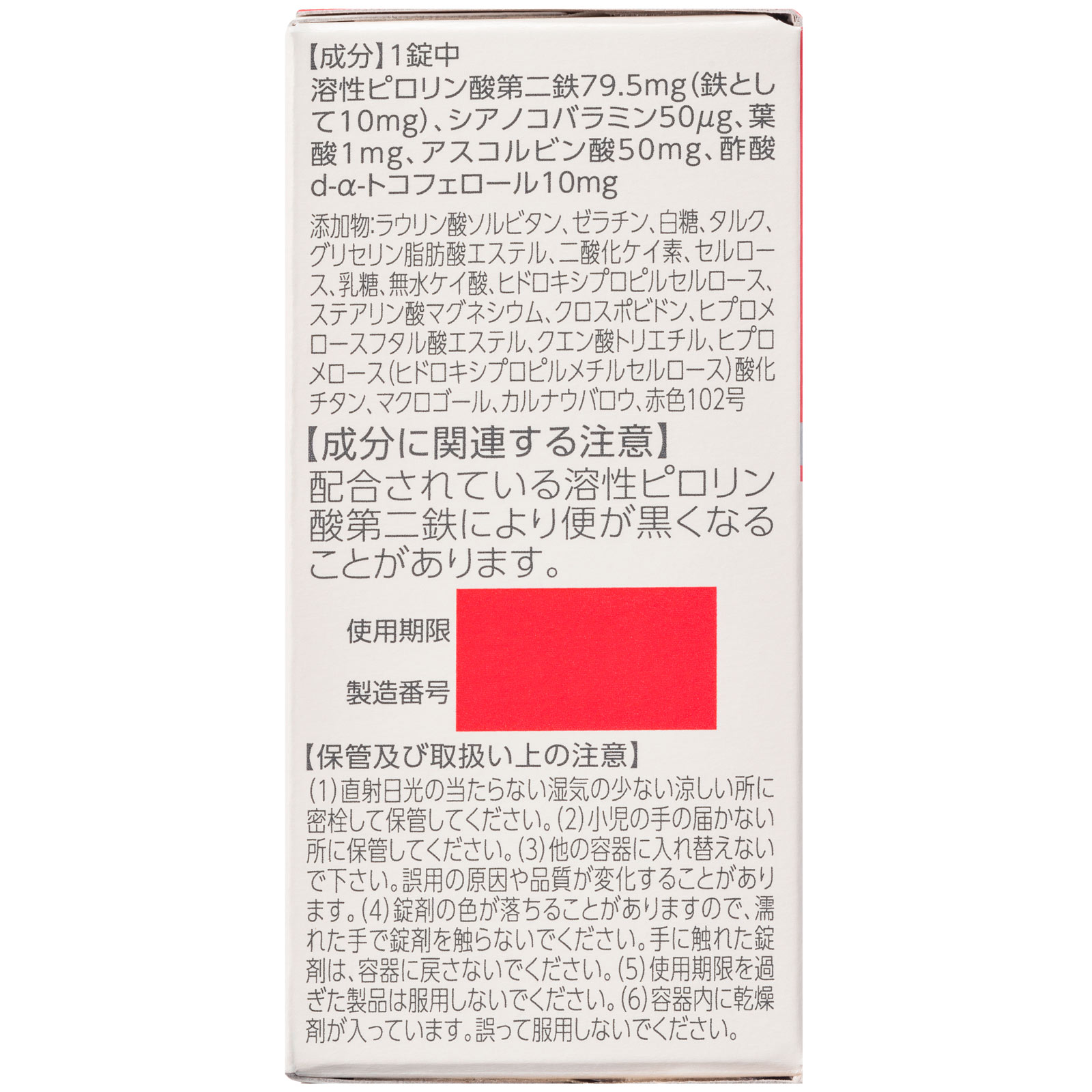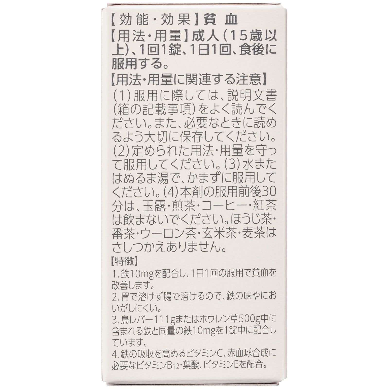 体に吸収されやすい鉄分に、ビタミンなどを配合した貧血用薬。1.鉄10mgを配合し、1日1回の服用で貧血を改善します。2.胃で溶けず腸で溶けるので、鉄の味やにおいがしにくい。3.鳥レバー111gまたはホウレン草500g中に含まれる鉄と同量の鉄10mgを1錠中に配合しています。4.鉄の吸収を高めるビタミンC、赤血球合成に必要なビタミンB12・葉酸、ビタミンEを配合。