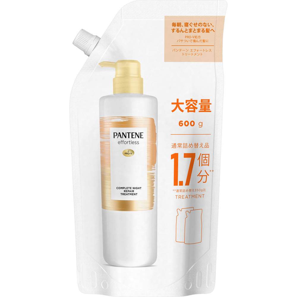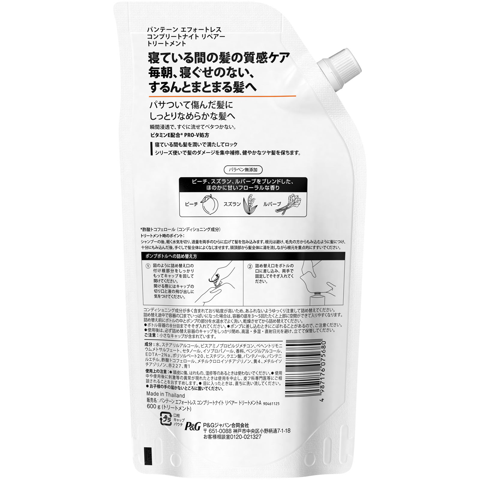 大容量通常詰め替え品1.7個分****通常詰め替え350g比寝ている間の髪の質感ケア毎朝、寝ぐせのない、するんとまとまる髪へパサついて傷んだ髪にしっとりなめらかな髪へ瞬間浸透で、すぐに流せてベタつかない。ビタミンE配合*PRO-V処方寝ている間も髪を潤いで満たしてロックシリーズ使いで髪のダメージを集中補修、健やかなツヤ髪を保ちます。パラベン無添加ピーチ、スズラン、ルバーブをブレンドした、ほのかに甘いフローラルな香り*酢酸トコフェロール(コンディショニング成分)