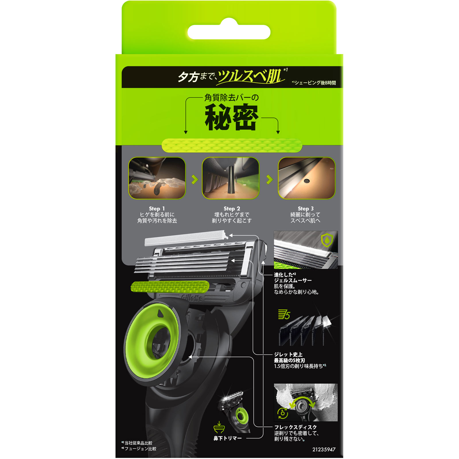 夕方まで、ツルスベ肌*1ジレット最高級の深剃り*1 シェービング後8時間進化した替刃*21.5倍刃の剃り味長持ち*3カミソリのハンドル5年保証!角質除去バーの秘密Step1 ヒゲを剃る前に角質や汚れを除去Step2 埋もれヒゲまで剃りやすく起こすStep3 綺麗に剃ってスベスベ肌へ○進化した*2ジェルスムーサー肌を保護。なめらかな剃り心地。○ジレット史上最高級の5枚刃1.5倍刃の剃り味長持ち*3○鼻下トリマー○フレックスディスク逆剃りでも密着して、剃り残さない。*2当社従来品比較*3フュージョン比較