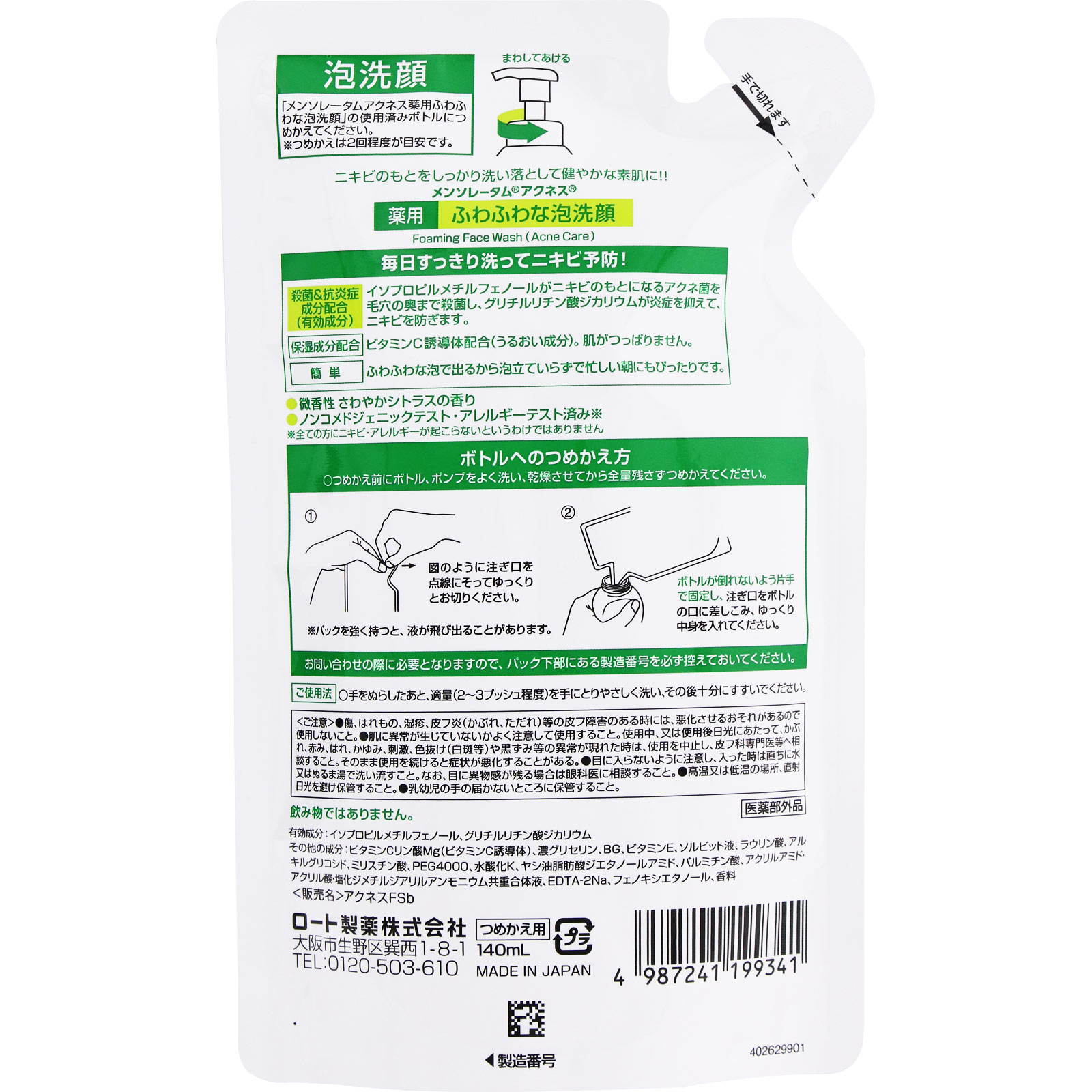 ふわふわな泡でニキビ予防お得なつめかえ用ニキビのもとをしっかり洗い落として健やかな素肌に!!毎日すっきり洗ってニキビ予防!○殺菌&抗炎症成分配合(有効成分)イソプロピルメチルフェノールがニキビのもとになるアクネ菌を毛穴の奥まで殺菌し、グリチルリチン酸ジカリウムが炎症を抑えて、ニキビを防ぎます。○保湿成分配合ビタミンC誘導体配合(うるおい成分)。肌がつっぱりません。○簡単ふわふわな泡で出るから泡立ていらずで忙しい朝にもぴったりです。●微香性 さわやかシトラスの香り●ノンコメドジェニックテスト・アレルギーテスト済み※※全ての方にニキビ・アレルギーが起こらないというわけではありません