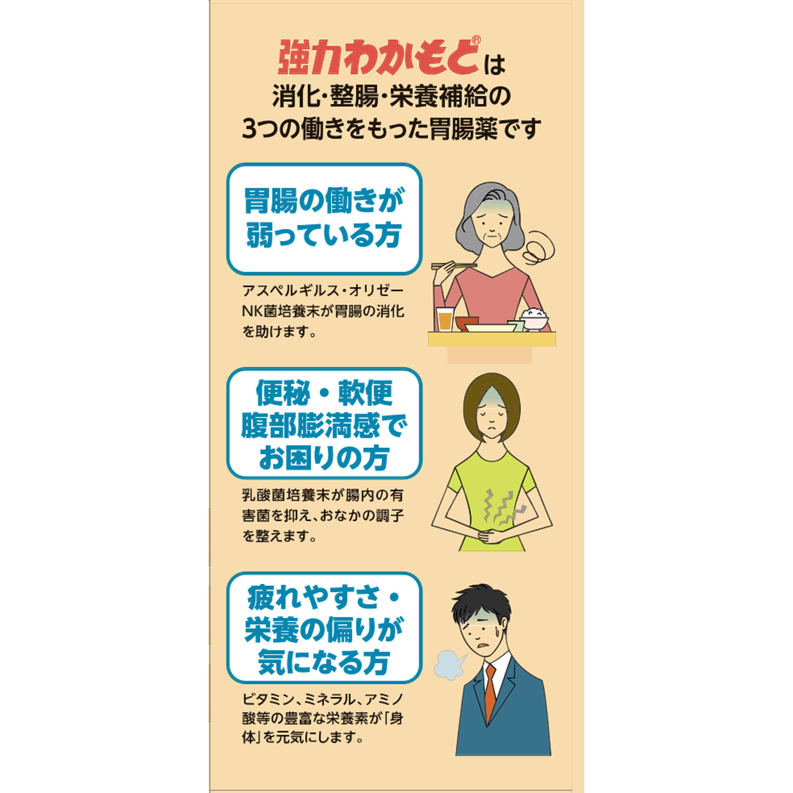 強力わかもとは、消化・整腸・栄養補給の3つの働きをもった胃腸薬です。