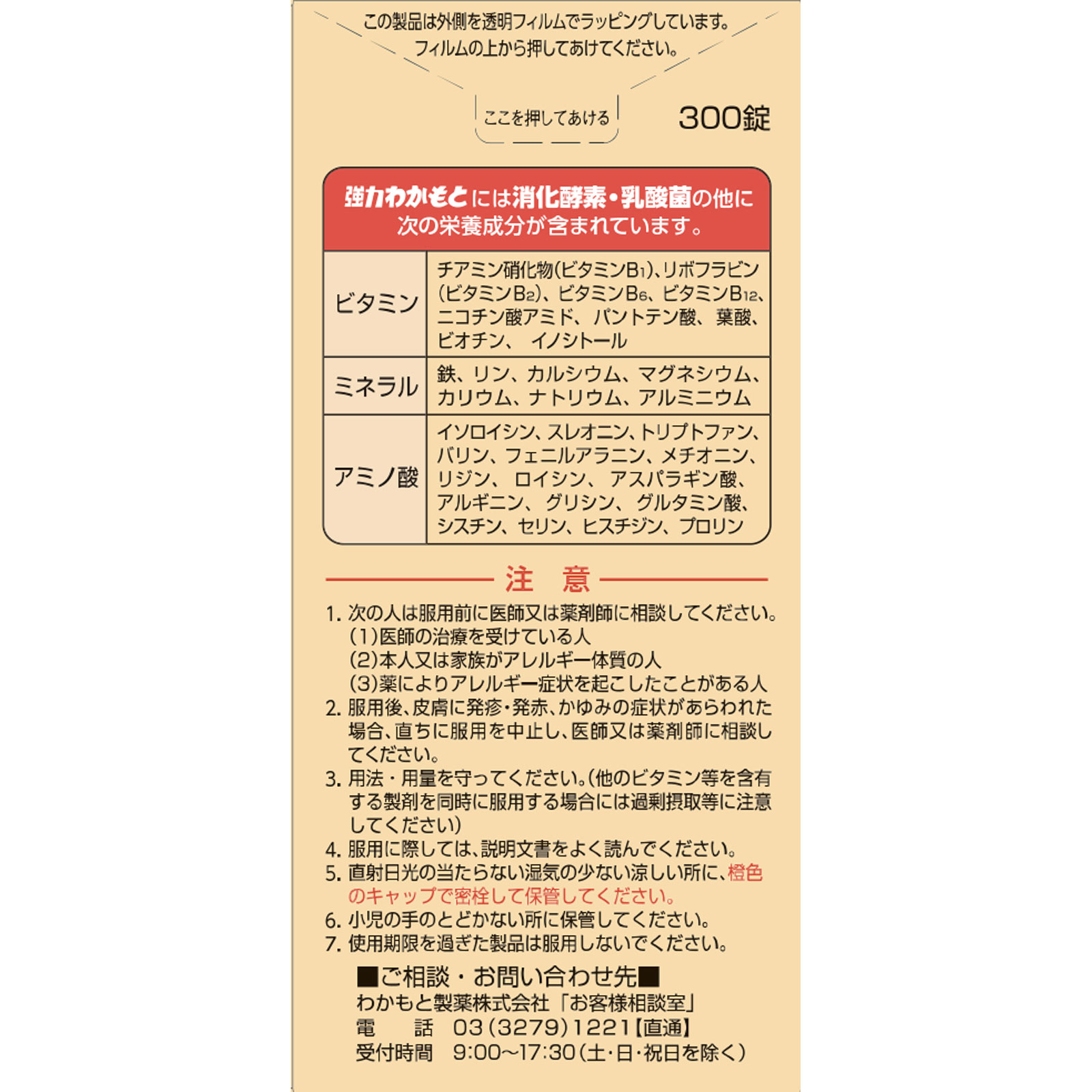 胃もたれ・便秘・疲れた体の栄養補給に強力わかもとは、消化・整腸・栄養補給の3つの働きをもった胃腸薬です。◆アスペルギルス・オリゼーNK菌培養末が弱った胃腸の消化を助け、胃のもたれや食欲不振などに効果があります。◆乳酸菌培養末が、腸内の有害菌を抑えて、おなかの調子を整え、おなかの張りに効果があります。また、便通を促し、便を柔らかくすることにより、便秘にも効果があります。◆2種類の培養末と酵母に含まれているビタミンB群をはじめとする豊富な栄養素が、滋養強壮、肉体疲労時の栄養補給などに役立ちます。◆3つの天然由来成分を主原料とした製品です。◆お子様からお年寄りの方まで幅広い年齢層の方に服用していただけます。現代社会を反映する胃腸障害、滋養強壮に胃に消化酵素腸に乳酸菌疲れた体の栄養補給にビール酵母強力わかもとには消化酵素・乳酸菌の他に次の栄養成分が含まれています。ビタミン:チアミン硝化物(ビタミンB1)、リボフラビン(ビタミンB2)、ビタミンB6、ビタミンB12、ニコチン酸アミド、パントテン酸、葉酸、ビオチン、イノシトールミネラル:鉄、リン、カルシウム、マグネシウム、カリウム、ナトリウム、アルミニウムアミノ酸:イソロイシン、スレオニン、トリプトファン、バリン、フェニルアラニン、メチオニン、リジン、ロイシン、アスパラギン酸、アルギニン、グリシン、グルタミン酸、シスチン、セリン、ヒスチジン、プロリン・胃腸の働きが弱っている方・便秘・軟便 腹部膨満感でお困りの方・疲れやすさ・栄養の偏りが気になる方ビタミン、ミネラル、アミノ酸等の豊富な栄養素が「身体」を元気にします。「強力わかもと」は、栄養素を豊富に含む米や麦の胚芽に、こうじ菌と乳酸菌を働かせ、さらに酵母とビタミンを加え、消化酵素・乳酸菌・ビタミンが豊富な自然の特性を生かした胃腸薬です。
