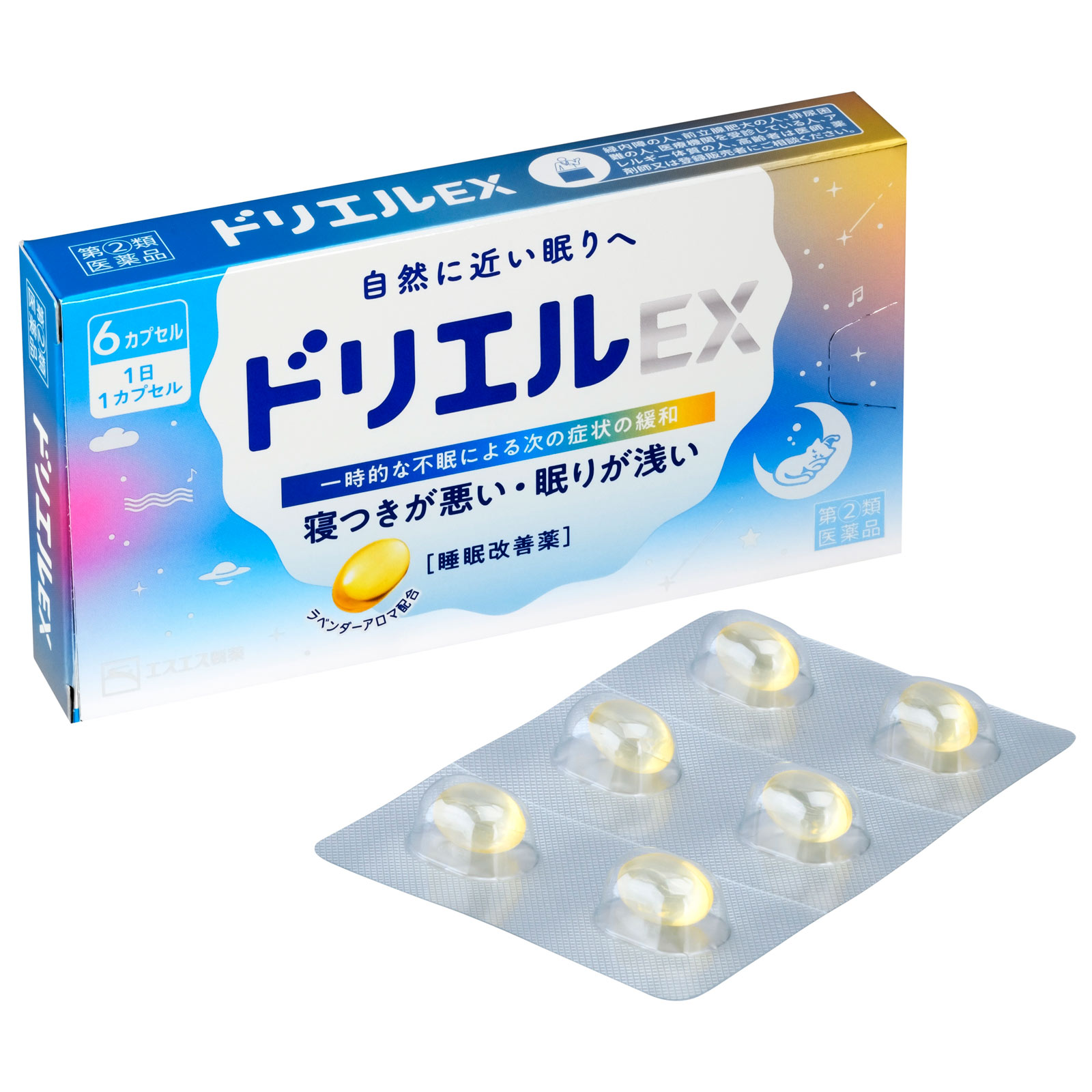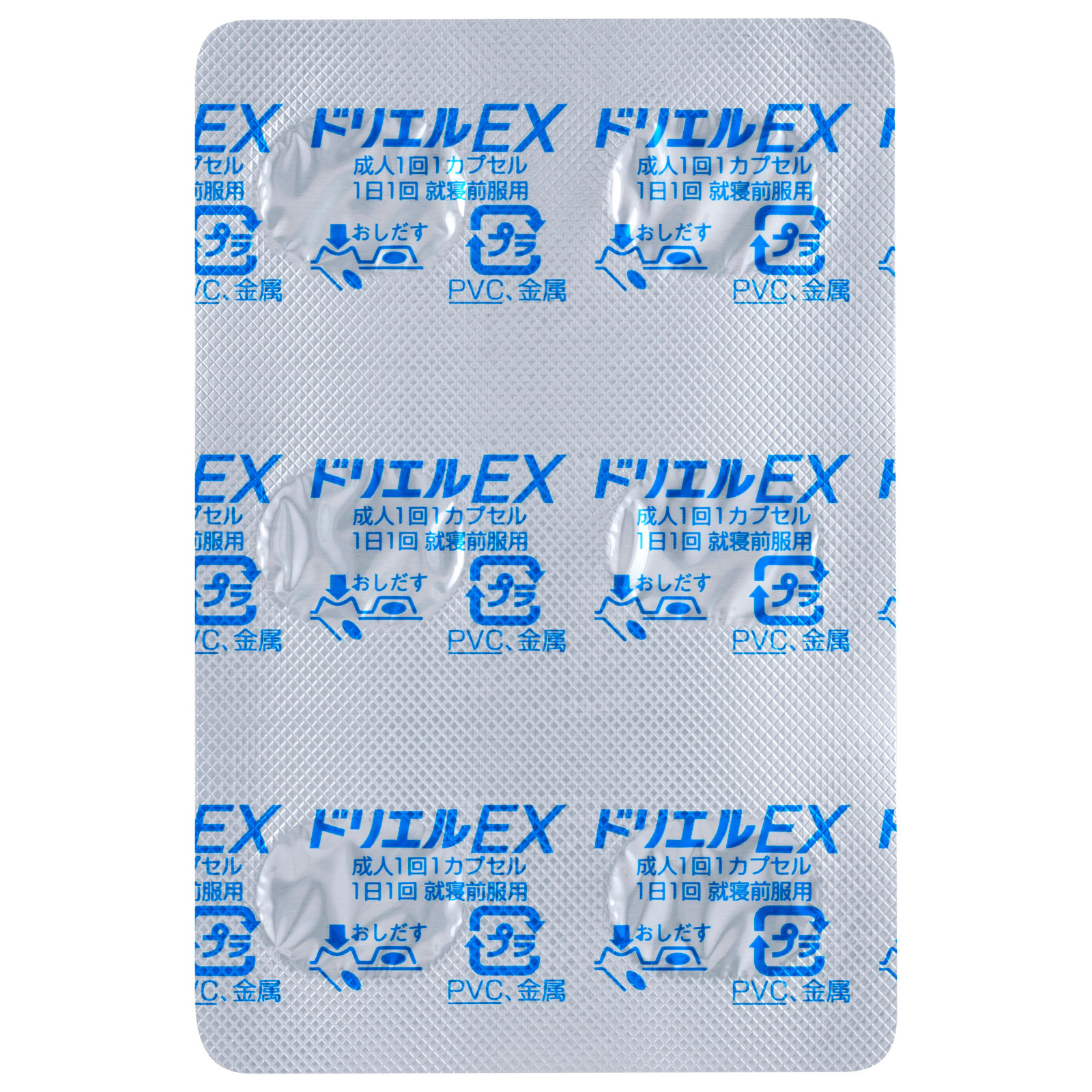 ●こんなとき、こんな方の一時的な不眠に○ストレスが多く、眠れない○疲れているのに、神経が高ぶって寝つけない○心配ごとがあって、夜中に目が覚める○不規則な生活で、睡眠リズムが狂い、寝つけない●ドリエルEXの特長○有効成分「ジフェンヒドラミン塩酸塩」の働きで、寝つけない、眠りが浅い時などの症状にすぐれた効果をあらわします。○中身が液状のカプセルタイプ。1回1カプセルを就寝前に服用してください。○ラベンダーアロマ配合。●ドリエルEXの効きめ成分ドリエルEXの効きめ成分(ジフェンヒドラミン塩酸塩)は、皮ふのかゆみをしずめたり、くしゃみや鼻水などのアレルギー症状をおさえる目的で広く使われていますが、服用により眠気をもよおすという作用があります。ドリエルEXはこのジフェンヒドラミン塩酸塩の持つ眠気の作用を応用してつくられた医薬品です。
