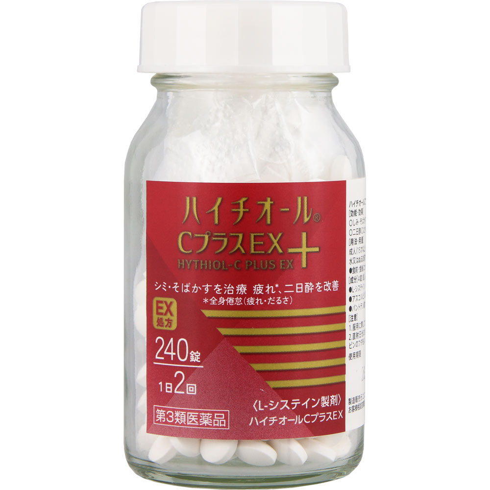 代謝を助けるL-システインとビタミンCが、しみなどの肌悩みに効く。L-システインとは・・・タンパク質を構成するアミノ酸の1つです。皮膚や肝臓に多く存在し、さまざまな代謝に関与することで、体の健康に大切な働きをしています。ハイチオールCプラスEXは、体の代謝を助けるアミノ酸“L-システイン”が体の内側から細胞に働きかけ、シミ・そばかすを治療する医薬品です。●体の内側からシミ・そばかすを治します。L-システインが肌細胞の生まれ変わりを正常化し、ビタミンCとの相乗効果で、シミ・そばかすの原因でもあるできてしまった過剰なメラニンを排出します。●シミ・そばかすには1日2回の継続服用が効果的です。肌は約42日間で生まれ変わります。新しい肌が表面の肌に成長するまで時間がかかりますので、継続服用が効果的です。ハイチオールCプラスEXが、シミ・そばかすを治していきます。●全身倦怠(疲れ・だるさ)、二日酔にも効果を発揮します。L-システインが肝臓で働き、体の代謝(エネルギー産生)を助け、疲れ・だるさを改善します。また、アルコールが代謝されてできるアセトアルデヒドと直接反応して無毒化したり、アルコールを無害な物質に変える酵素の働きを助け、二日酔にも効果を発揮します。