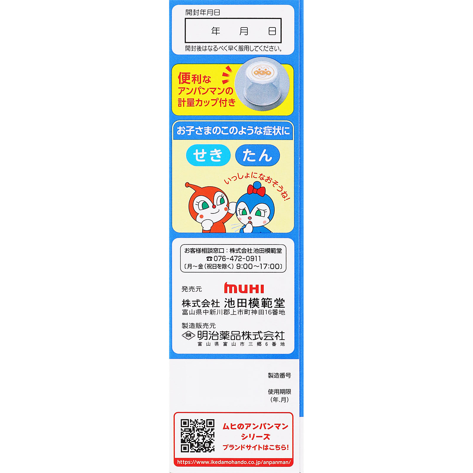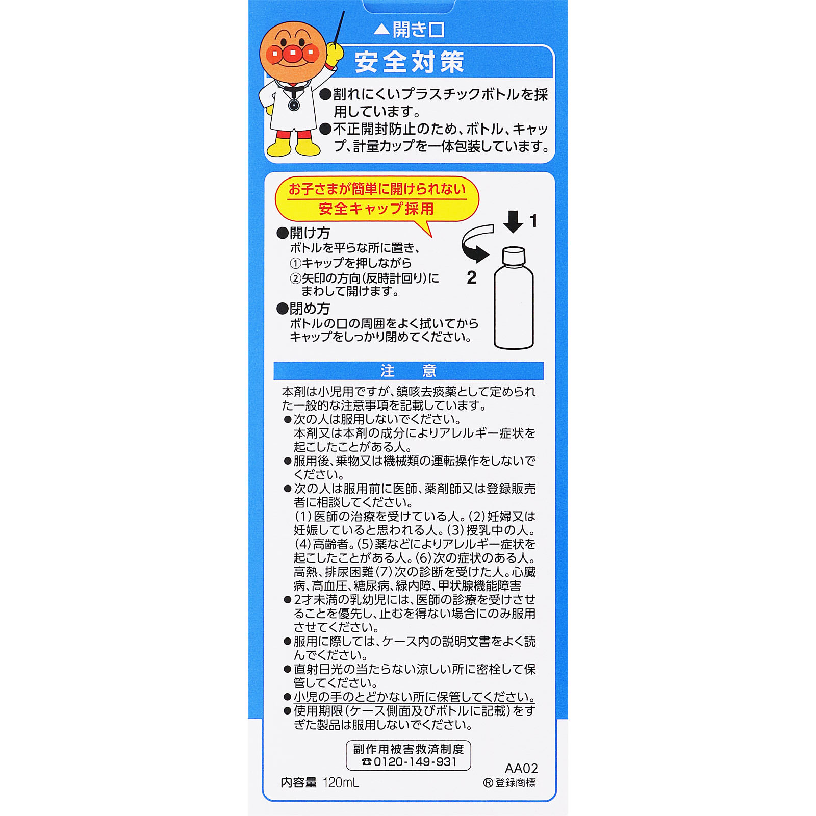 ●お子さま好みの「イチゴ味」のシロップ剤です。「アンパンマン」のデザインで、小さなお子さまにも飲ませやすいように工夫してあります。
