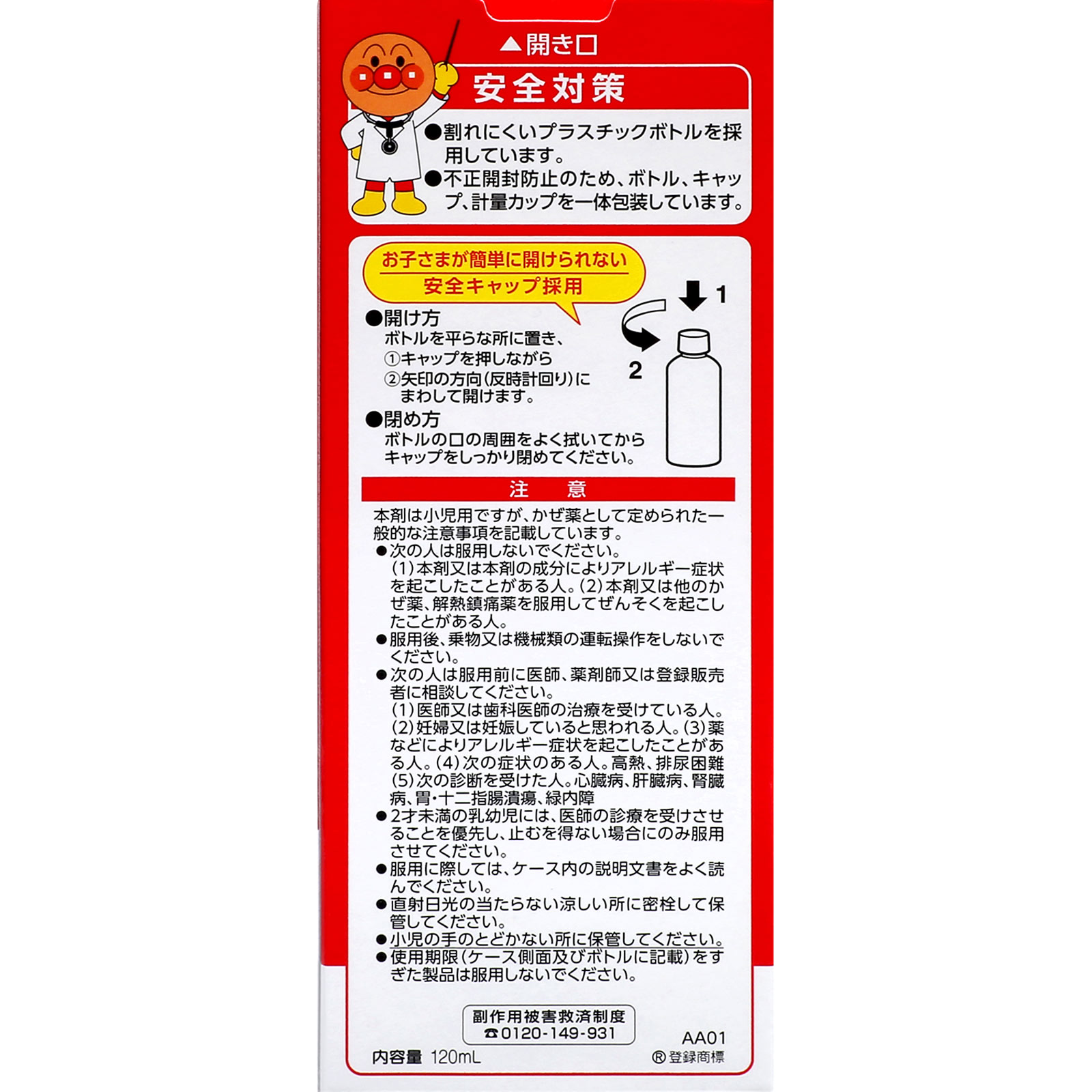●お子さま好みの「イチゴ味」のシロップ剤です。「アンパンマン」のデザインで、小さなお子さまにも飲ませやすいように工夫してあります。