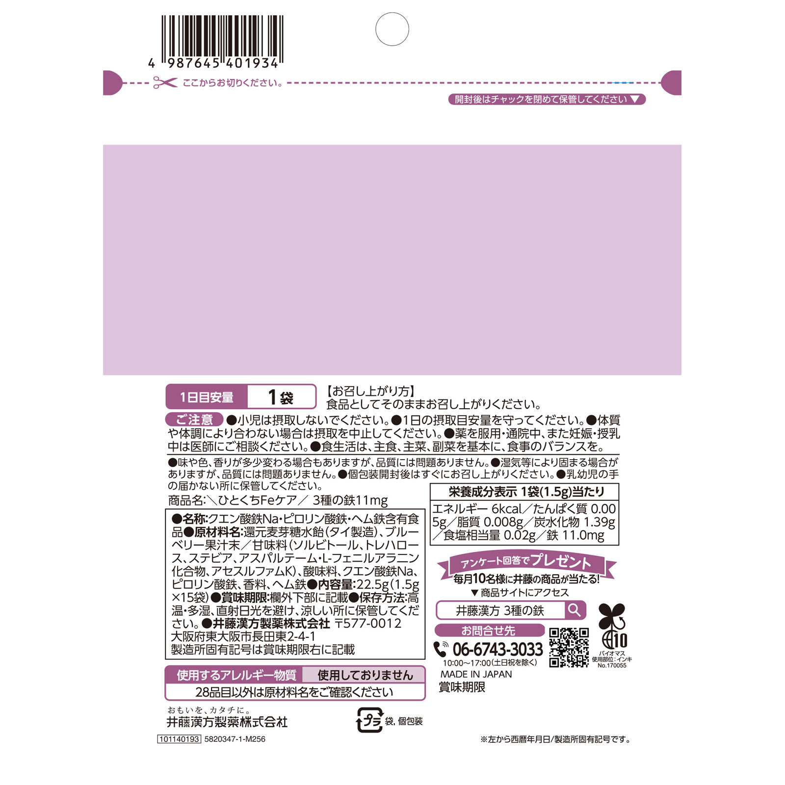 還元麦芽糖水飴(タイ製造)、ブルーベリー果汁末/甘味料(ソルビトール、トレハロース、ステビア、アスパルテーム・L-フェニルアラニン化合物、アセスルファムK)、酸味料、クエン酸鉄Na、ピロリン酸鉄、香料、ヘム鉄