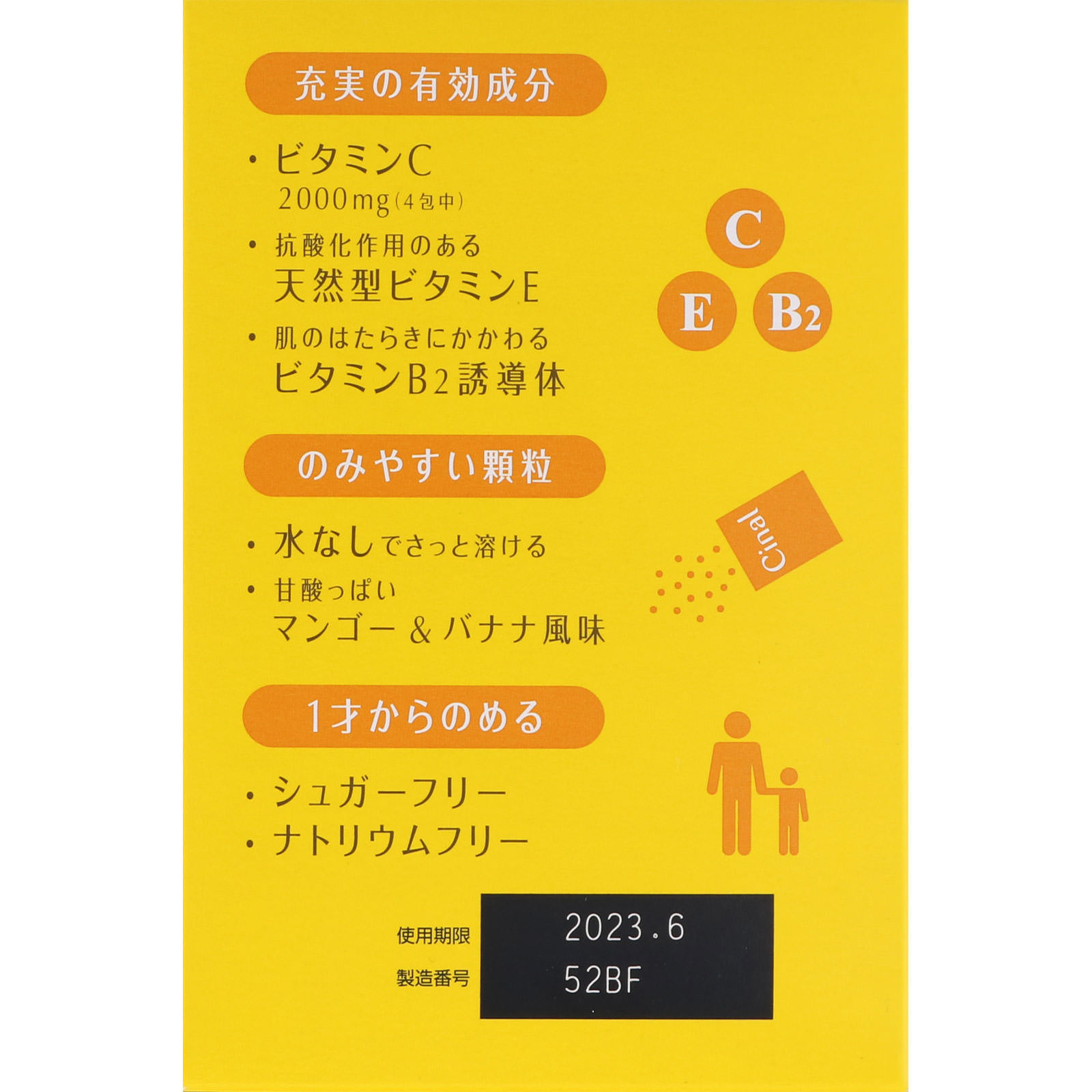 シナールEX顆粒eは、ビタミンCの補給に適したビタミン剤で、口の中でさっと溶けるのみやすい顆粒です。またビタミンCとともに抗酸化作用をもつ天然型ビタミンE、皮ふの正常な働きをサポートするビタミンB2を配合しています。