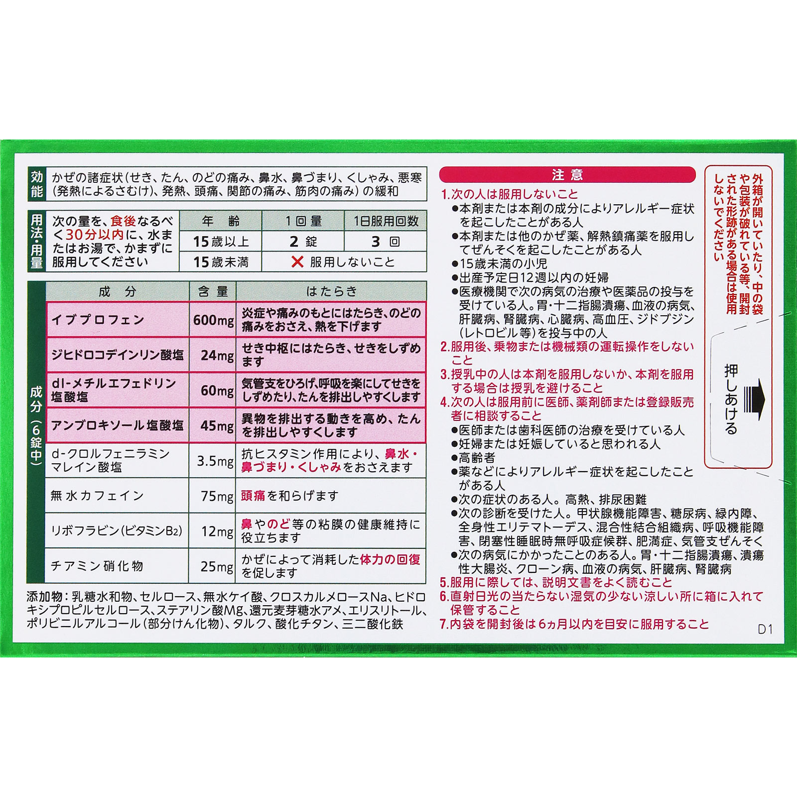 熱や鼻、せきなどのつらいかぜの諸症状に効果を発揮する総合感冒薬。●イブプロフェンを600mg(1日量)配合し、のどの痛みをおさえ、熱を下げます。●ジヒドロコデインリン酸塩が、せき中枢にはたらき、せきをしずめます。●dl-メチルエフェドリン塩酸塩が、気管支をひろげ、呼吸を楽にしてせきをしずめたり、たんを排出しやすくします。●アンブロキソール塩酸塩が、気道粘膜で異物を排出する動きを高め、たんを排出しやすくします。●8種の成分を配合し、かぜのいろいろな症状を緩和します。●のみやすい小型の淡黄色のカプレットタイプの錠剤です。
