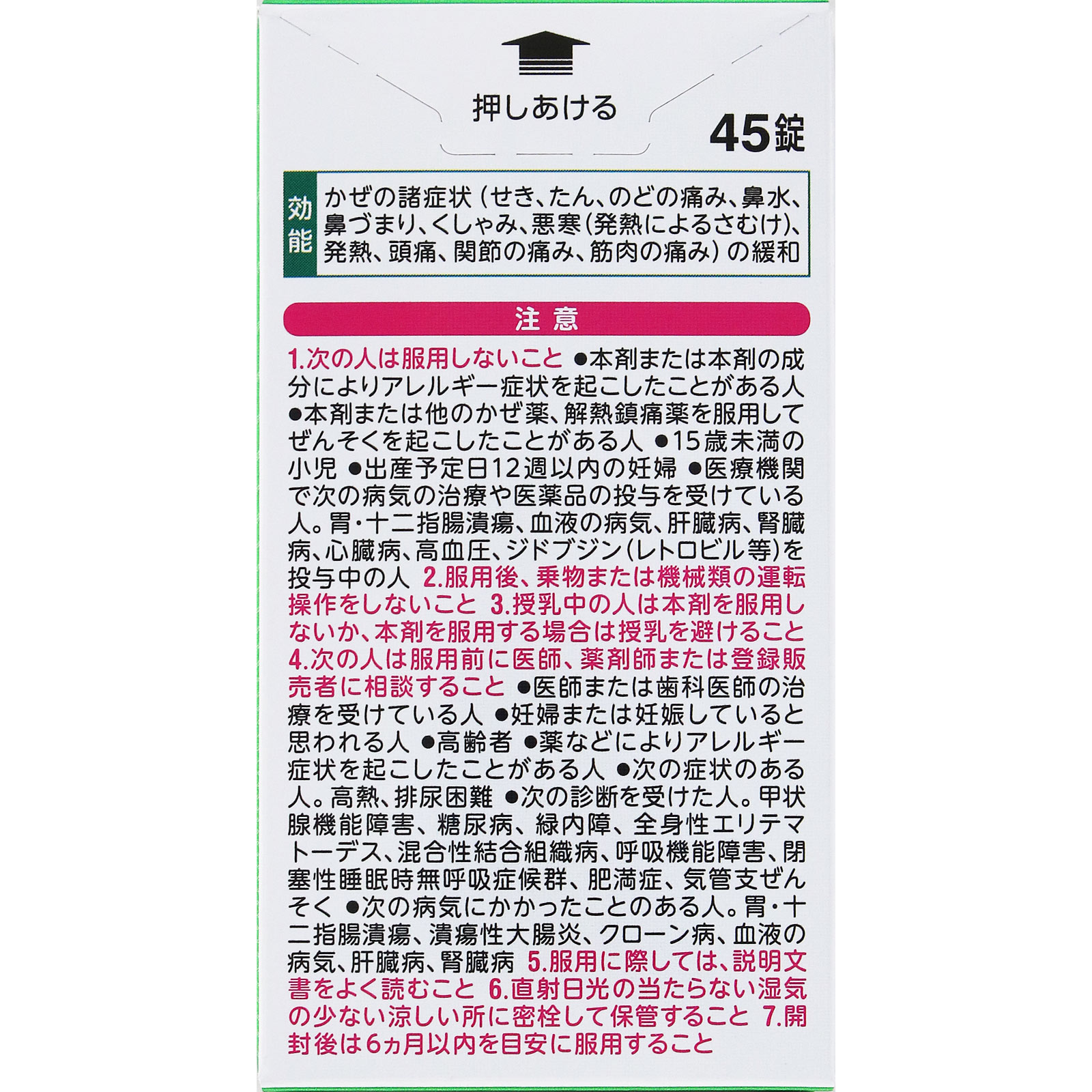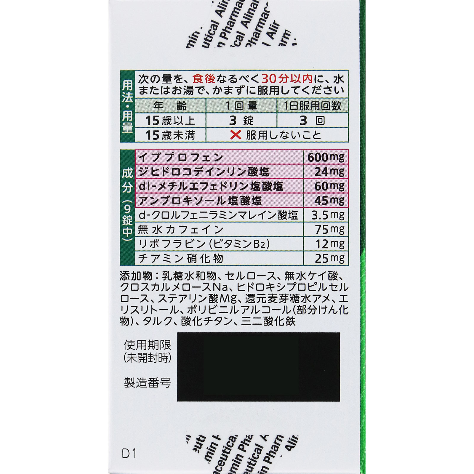 熱や鼻、せきなどのつらいかぜの諸症状に効果を発揮する総合感冒薬。●イブプロフェンを600mg(1日量)配合し、のどの痛みをおさえ、熱を下げます。●ジヒドロコデインリン酸塩が、せき中枢にはたらき、せきをしずめます。●dl-メチルエフェドリン塩酸塩が、気管支をひろげ、呼吸を楽にしてせきをしずめたり、たんを排出しやすくします。●アンブロキソール塩酸塩が、気道粘膜で異物を排出する動きを高め、たんを排出しやすくします。●8種の成分を配合し、かぜのいろいろな症状を緩和します。●のみやすい小型の淡黄色の円形の錠剤です。