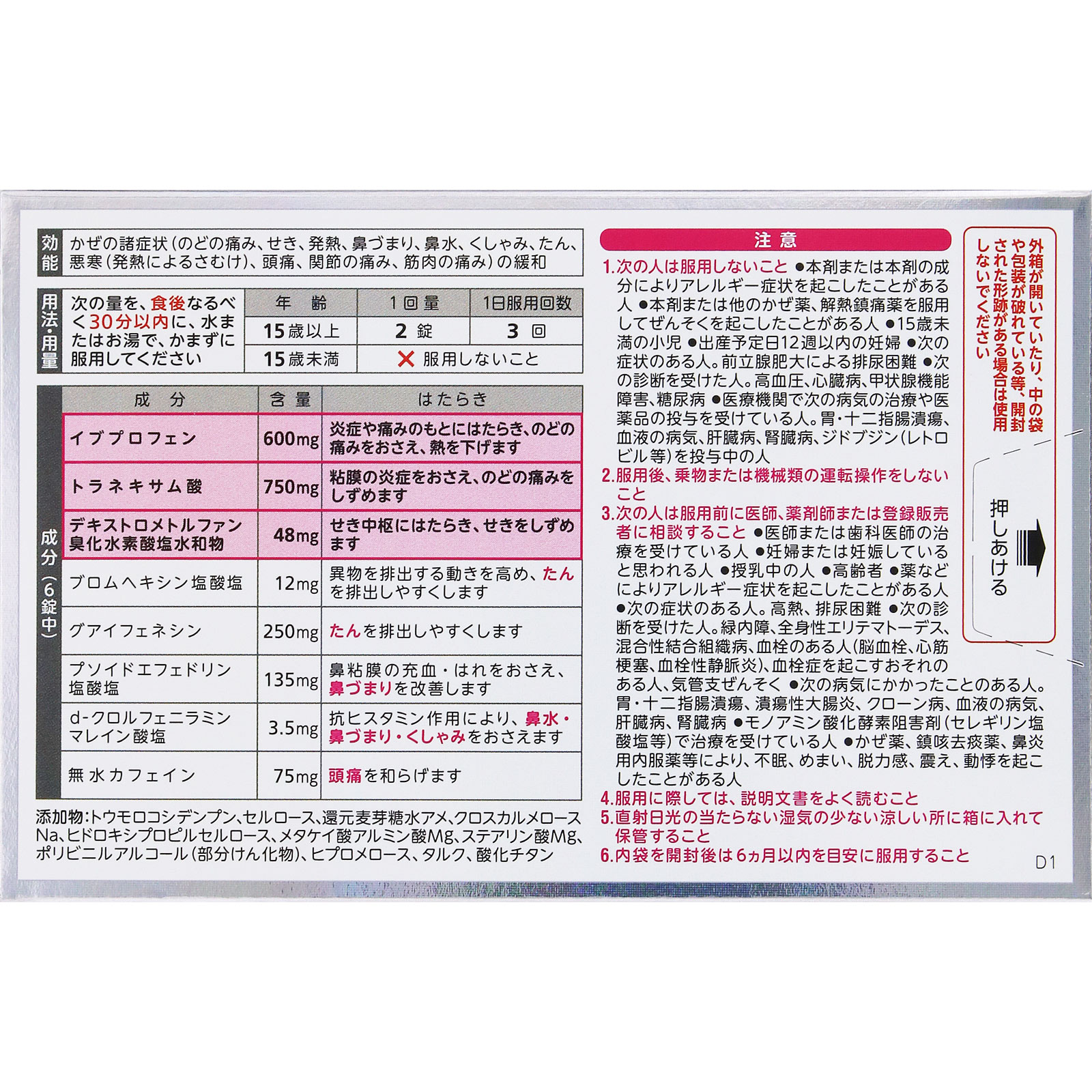 熱や鼻、せきなどのつらいかぜの諸症状に効果を発揮する総合感冒薬。●イブプロフェンを600mg(1日量)配合し、のどの痛みをおさえ、熱を下げます。●トラネキサム酸が粘膜の炎症をおさえ、のどの痛みをしずめます。●デキストロメトルファン臭化水素酸塩水和物が、せき中枢にはたらき、せきをしずめます。●8種の成分を配合し、かぜのいろいろな症状を緩和します。●のみやすい小型の白色~帯黄白色のカプレットタイプの錠剤です。