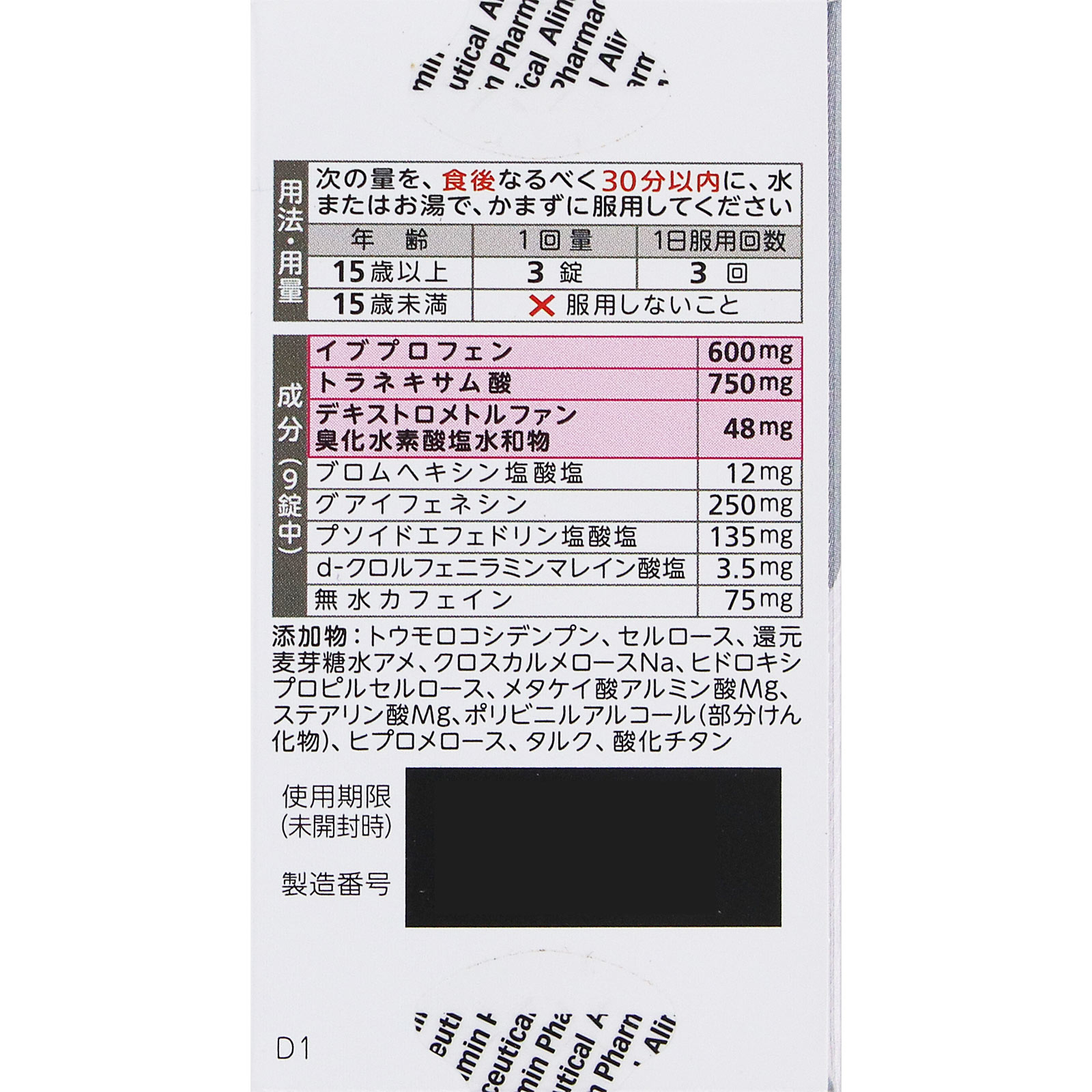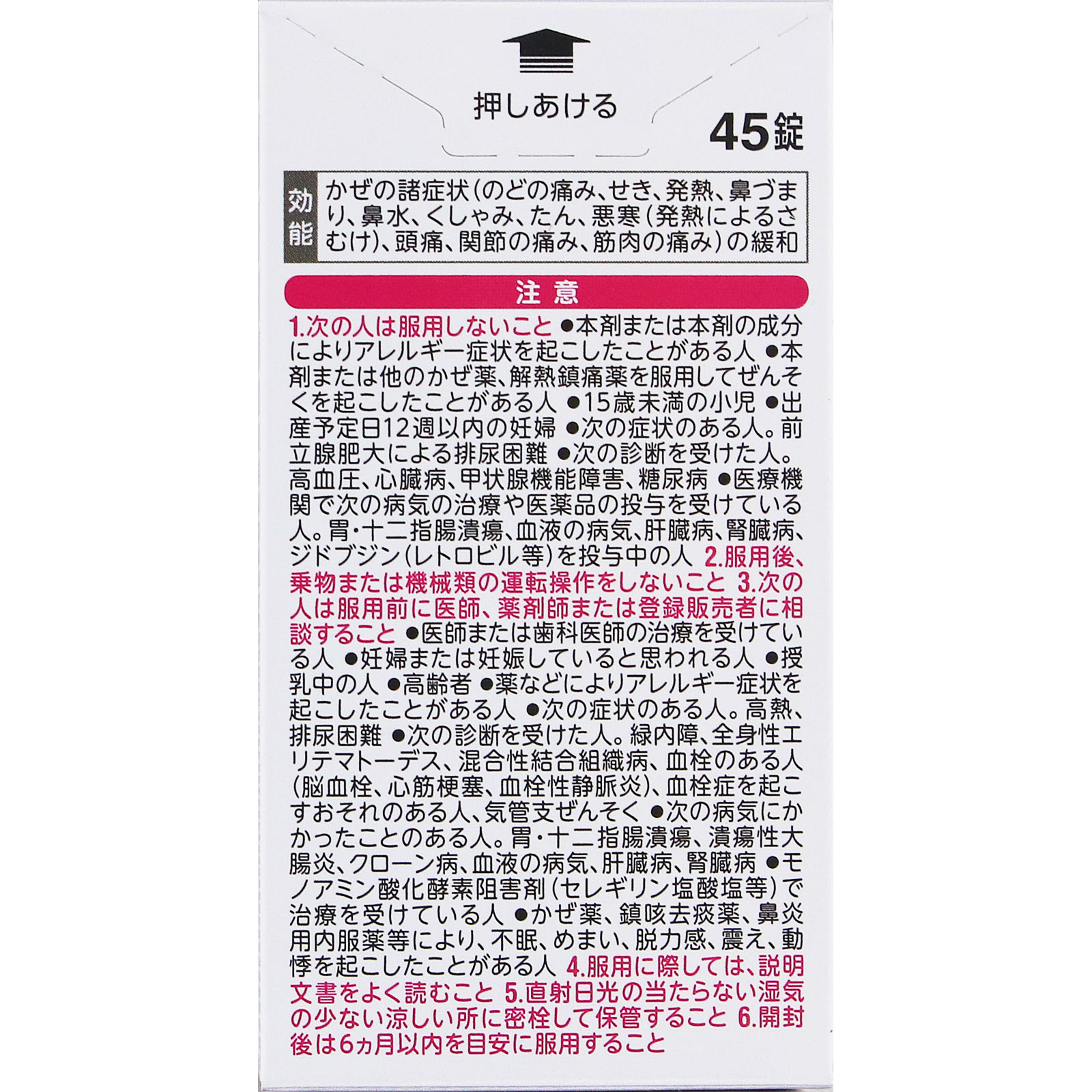 熱や鼻、せきなどのつらいかぜの諸症状に効果を発揮する総合感冒薬。●イブプロフェンを600mg(1日量)配合し、のどの痛みをおさえ、熱を下げます。●トラネキサム酸が粘膜の炎症をおさえ、のどの痛みをしずめます。●デキストロメトルファン臭化水素酸塩水和物が、せき中枢にはたらき、せきをしずめます。●8種の成分を配合し、かぜのいろいろな症状を緩和します。●のみやすい小型の白色~帯黄白色の円形の錠剤です。