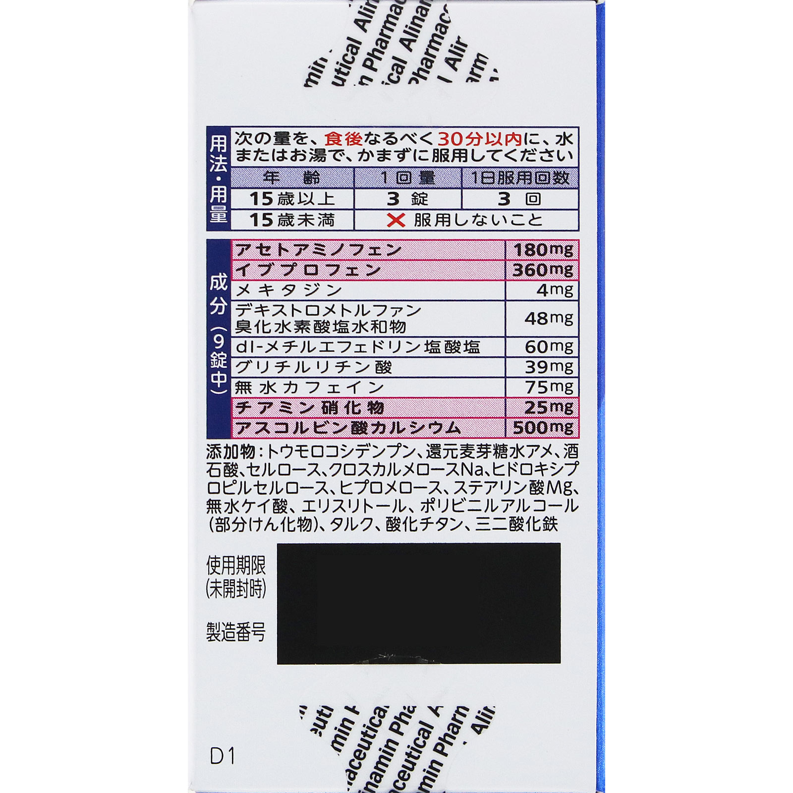 添加物:トウモロコシデンプン、還元麦芽糖水アメ、酒石酸、セルロース、クロスカルメロースNa、ヒドロキシプロピルセルロース、ヒプロメロース、ステアリン酸Mg、無水ケイ酸、エリスリトール、ポリビニルアルコール(部分けん化物)、タルク、酸化チタン、三二酸化鉄