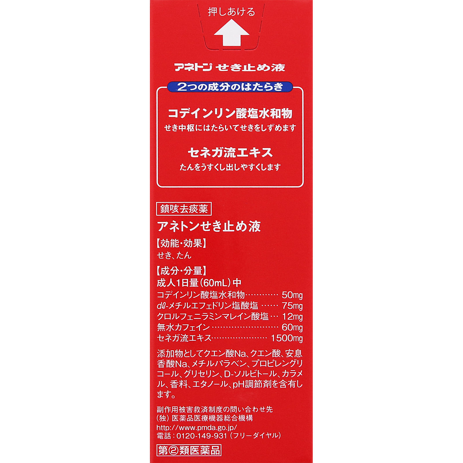 コデインリン酸塩水和物・・・50mg・・・せきを起こす中枢に作用し、せきをおさえるすぐれた効果があります。