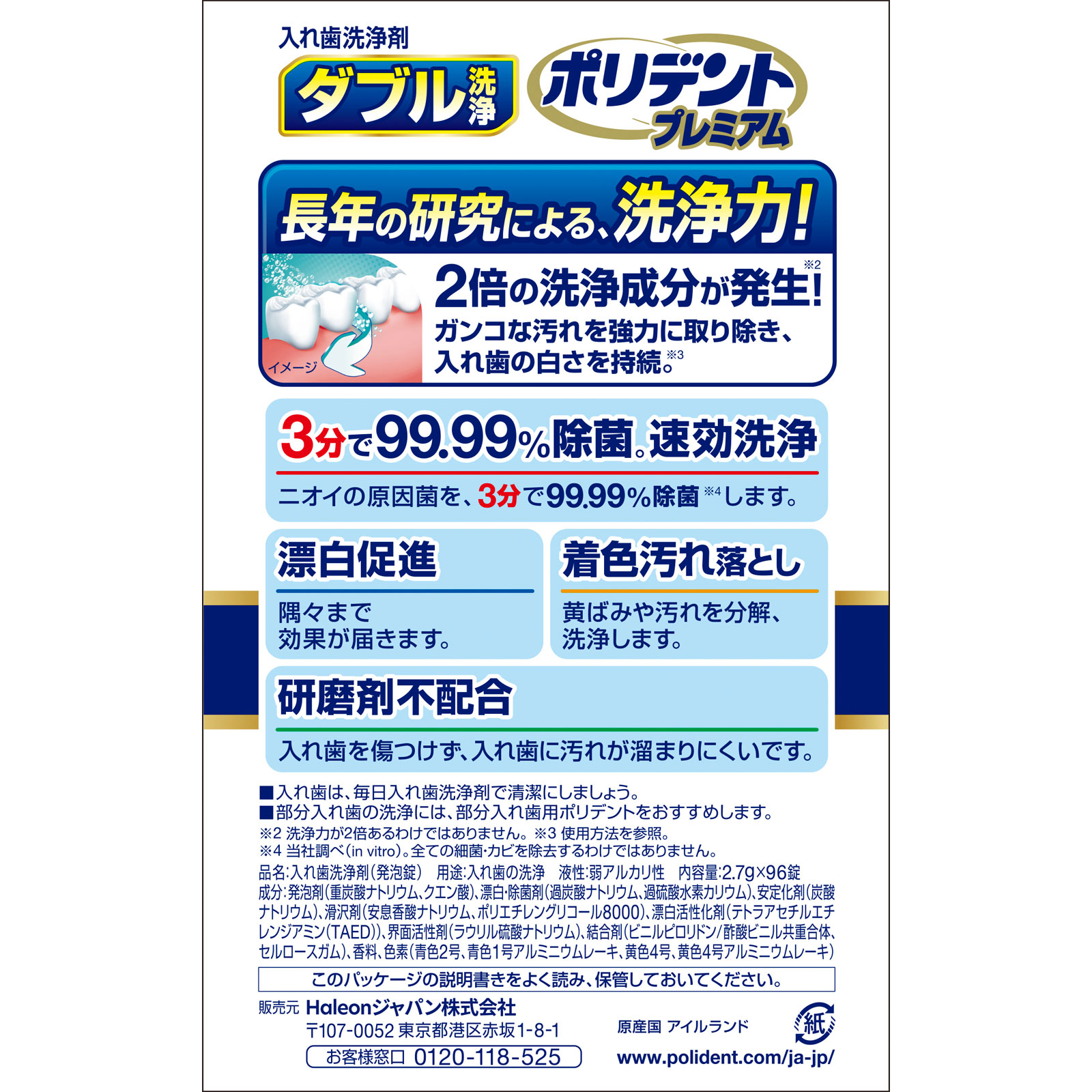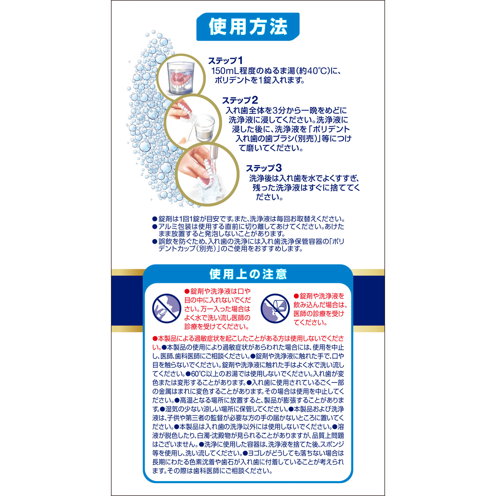 No.1※1 歯科医推奨ブランドW 酵素入りの2倍の洗浄成分※2除菌率99.99%※4発泡!分解!※1 義歯洗浄剤内。当社が第三者調査機関へ委託し、歯科医師サンプル200名へ2024年6月に実施した定量調査に基づく。○長年の研究による、洗浄力!2倍の洗浄成分が発生!※2ガンコな汚れを強力に取り除き、入れ歯の白さを持続※3。○3分で99.99%除菌。速効洗浄ニオイの原因菌を、3分で99.99%除菌※4します。○漂白促進隅々まで効果が届きます。○着色汚れ落とし黄ばみや汚れを分解、洗浄します。○研磨剤不配合入れ歯を傷つけず、入れ歯に汚れが溜まりにくいです。■入れ歯は、毎日入れ歯洗浄剤で清潔にしましょう。■部分入れ歯の洗浄には、部分入れ歯用ポリデントをおすすめします。※2 洗浄力が2倍あるわけではありません。※3 使用方法を参照。※4 当社調べ(in vitro)。全ての細菌・カビを除去するわけではありません。