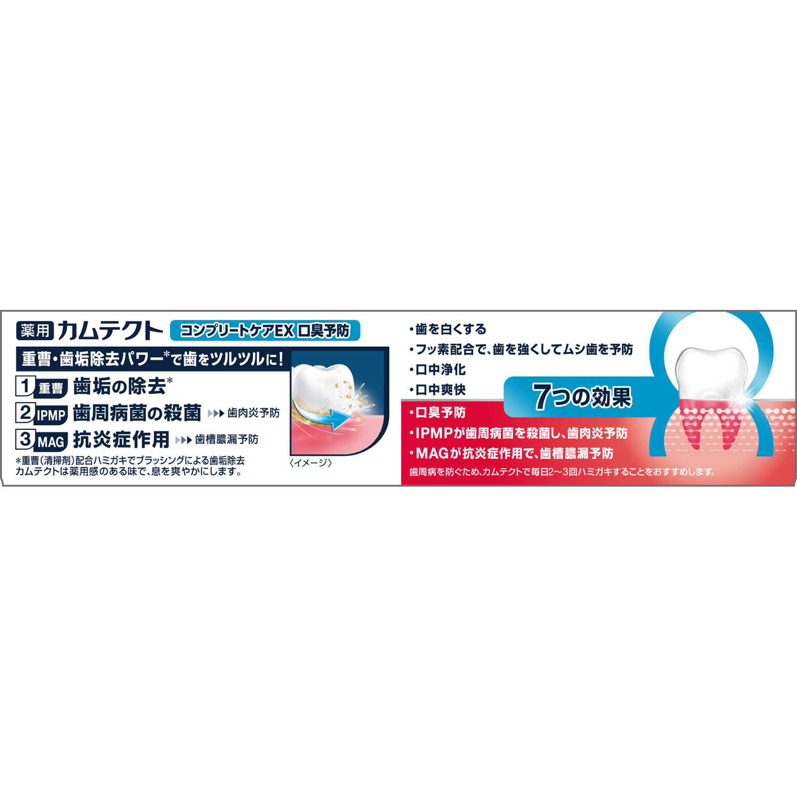 歯ぐきから、噛む力歯周病予防○重曹・歯垢除去パワー*で歯をツルツルに!1 重曹 歯垢の除去*2 IPMP 歯周病菌の殺菌:歯肉炎予防3 MAG 抗炎症作用:歯槽膿漏予防*重曹(清掃剤)配合ハミガキでブラッシングによる歯垢除去カムテクトは薬用感のある味で、息を爽やかにします。○7つの効果・歯を白くする・フッ素配合で、歯を強くしてムシ歯を予防・口中浄化・口中爽快・口臭予防・IPMPが歯周病菌を殺菌し、歯肉炎予防・MAGが抗炎症作用で、歯槽膿漏予防歯周病を防ぐため、カムテクトで毎日2~3回ハミガキすることをおすすめします。●歯ぐきからの出血が気になる方のために特別に開発。健康な歯ぐきと強い歯のためのオールインワンハミガキ。●息スッキリ!息キレイ!気になる口臭を防いで、お口のフレッシュな爽快感が続く、薬用感のあるミントの香味。●高濃度フッ素配合〈1400ppm〉。