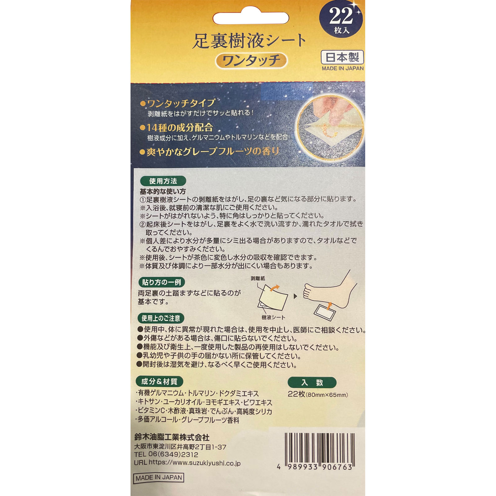 ワンタッチ足裏樹液シート グレープフルーツ 22枚