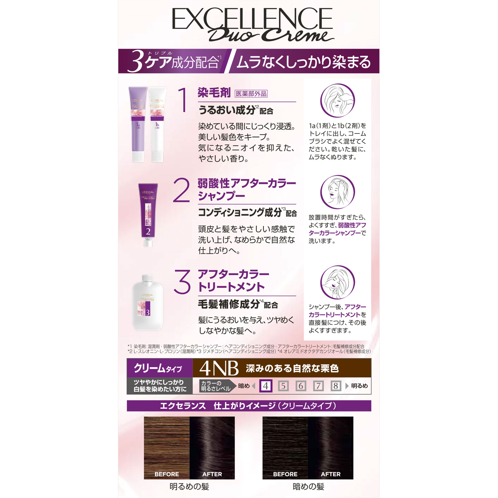 小分けもできる二剤式3ケア成分配合*1 ムラなくしっかり染まる1.染毛剤うるおい成分*2配合染めている間にじっくり浸透。美しい髪色をキープ。気になるニオイを抑えた、やさしい香り。2.弱酸性アフターカラーシャンプーコンディショニング成分*3配合頭皮と髪をやさしい感触で洗い上げ、なめらかで自然な仕上がりへ。3.アフターカラートリートメント毛髪補修成分*4配合髪にうるおいを与え、ツヤめくしなやかな髪へ。*1 染毛剤:湿潤剤・弱酸性アフターカラーシャンプー:ヘアコンディショニング成分・アフターカラートリートメント:毛髪補修成分配合*2 L-スレオニン・L-プロリン(湿潤剤)*3 ジメチコン(ヘアコンディショニング成分)*4 オレアミドオクタデカンジオール(毛髪補修成分)ツヤやかにしっかり白髪を染めたい方にカラーの明るさレベル:4便利な付属品つき:手袋 コームブラシ ケープ