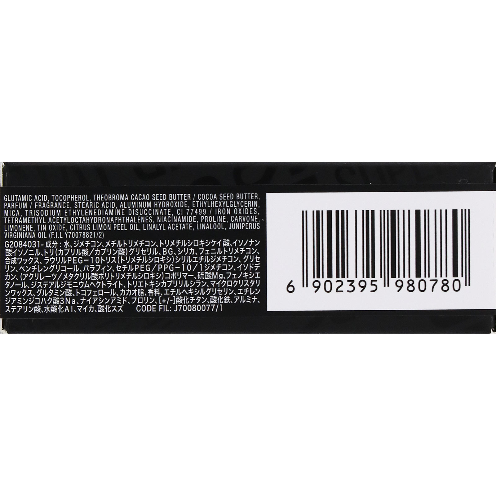 タノール、ジステアルジモニウムヘクトライト、トリエトキシカプリリルシラン、マイクロクリスタリンワックス、グルタミン酸、トコフェロール、カカオ脂、香料、エチルヘキシルグリセリン、エチレンジアミンジコハク酸3Na、ナイアシンアミド、プロリン、[+/-]酸化チタン、酸化鉄、アルミナ、ステアリン酸、水酸化Al、マイカ、酸化スズ