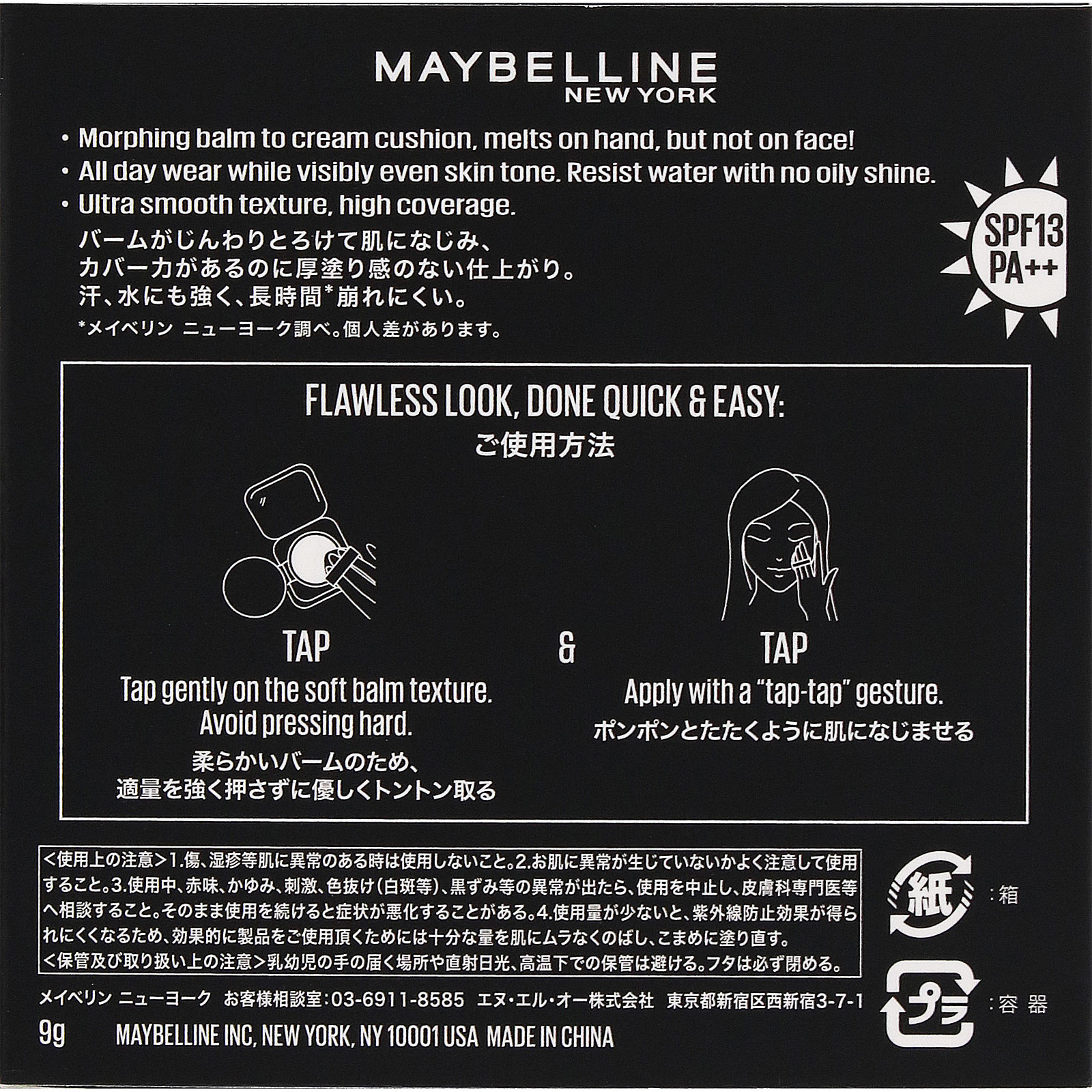 SPF13PA++バームがじんわりとろけて肌になじみ、カバー力があるのに厚塗り感のない仕上がり。汗、水にも強く、長時間*崩れにくい。*メイベリン ニューヨーク調べ。個人差があります。